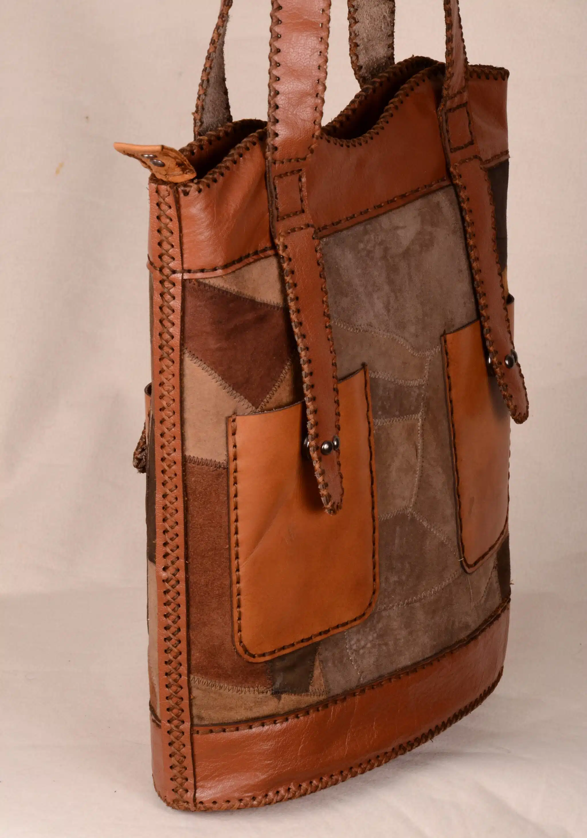 A bag made entirely of genuine leather inside and out, made with patchwork technology. The bag has two sides, both different, so you have two bags in one bag. The bag has 4 external pockets and 4 internal pockets. Its height is 37 cm, its width is 32 cm, and the base is oval, 30 cm x 13 cm. The bag’s color cannot be repeated again. Each time a different color is made. The bag is very practical and suitable for daily use.