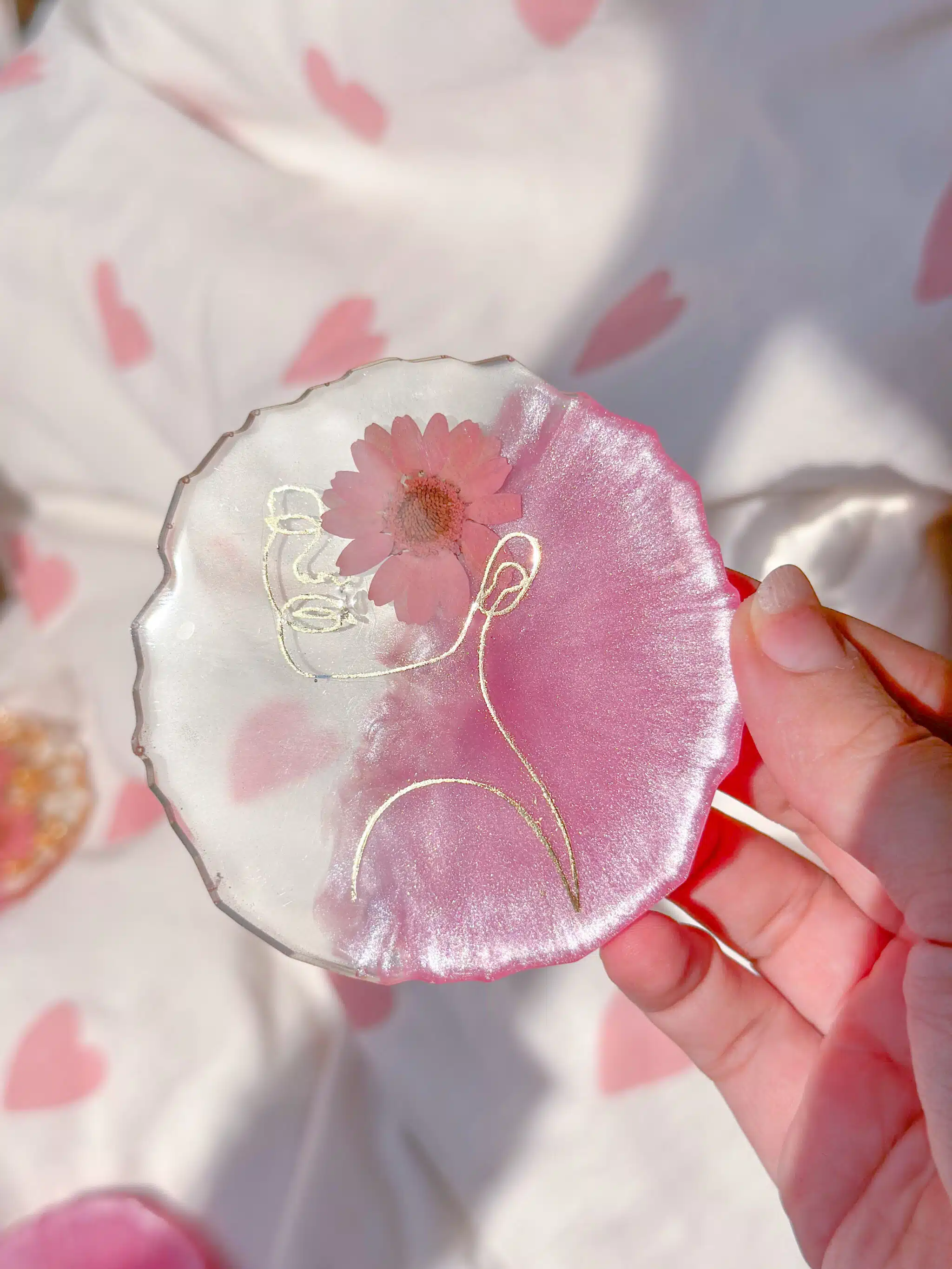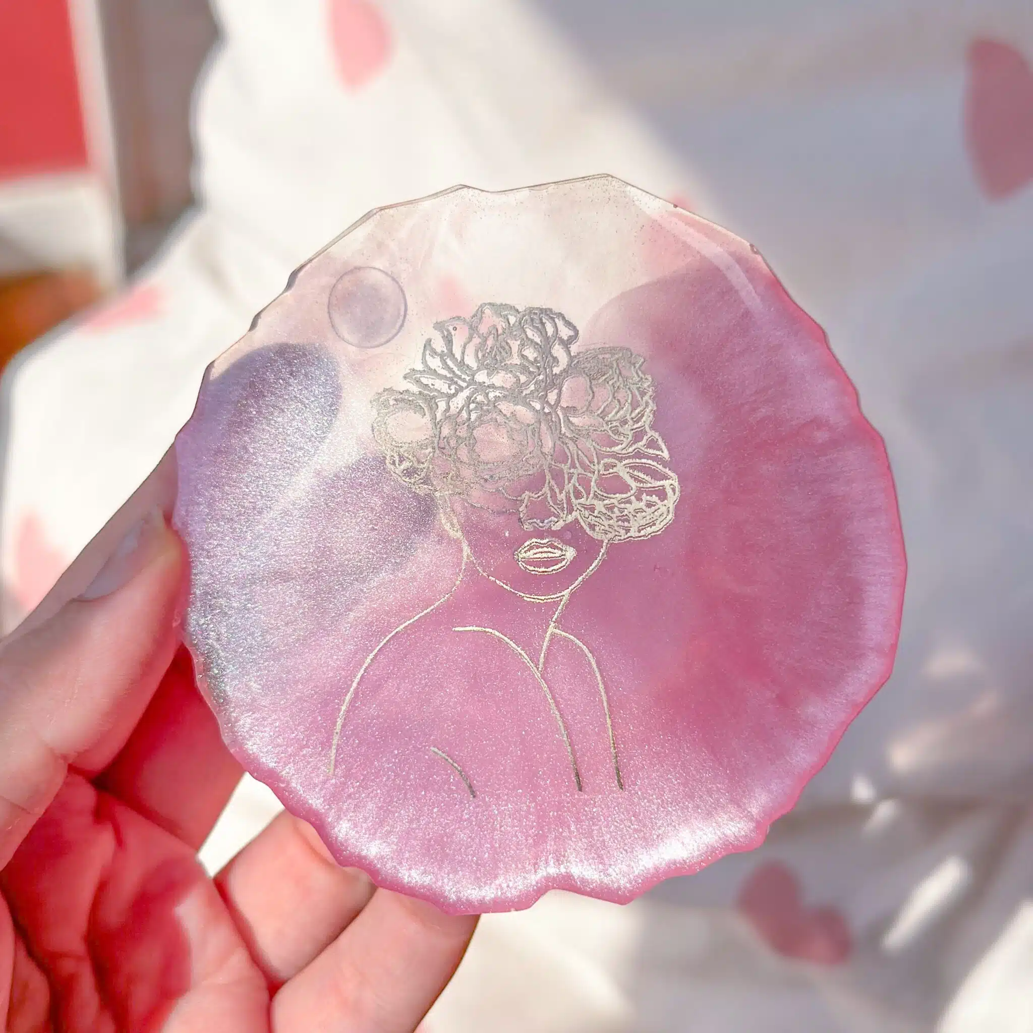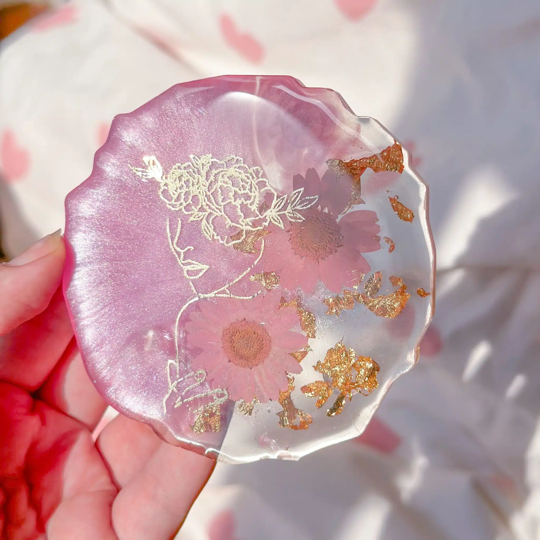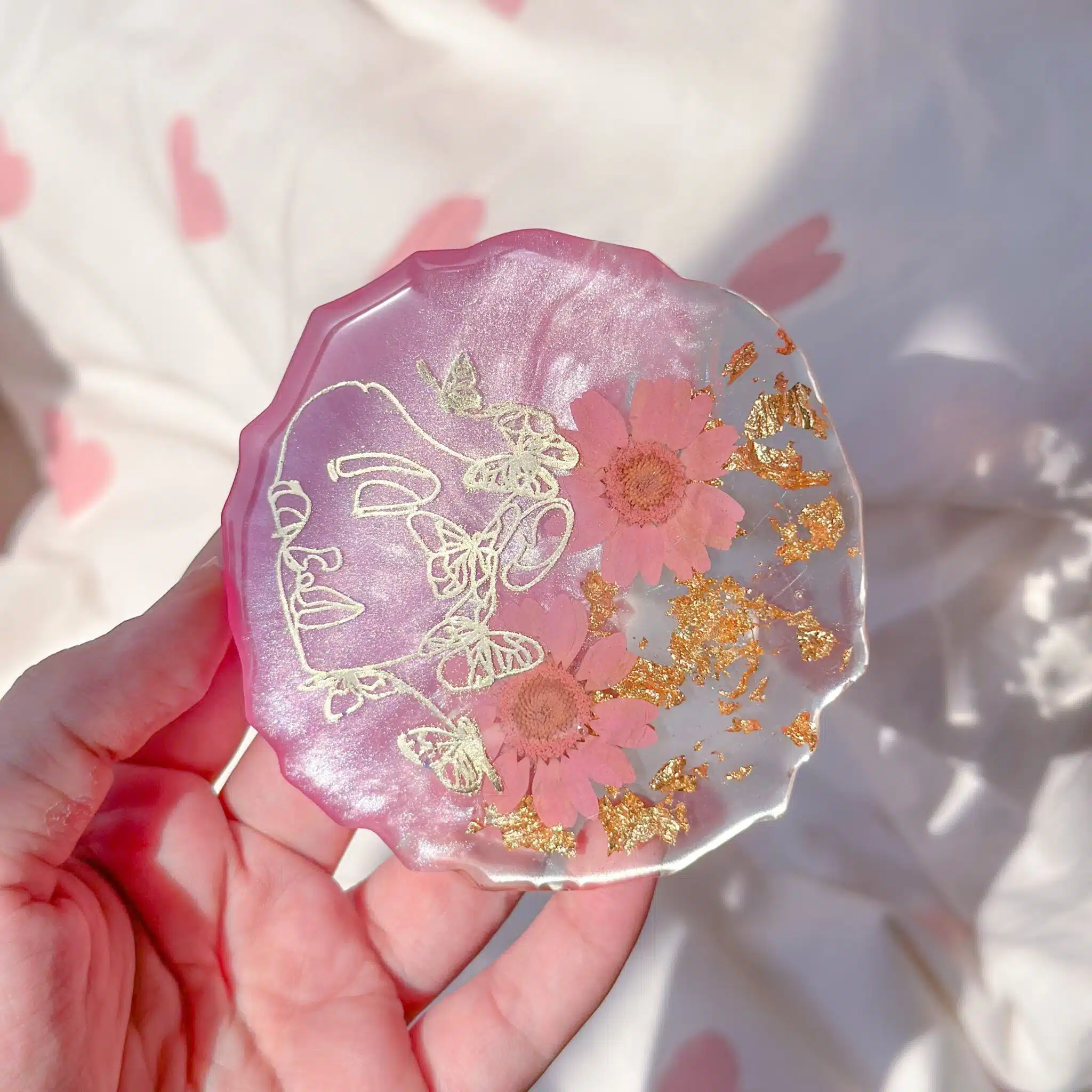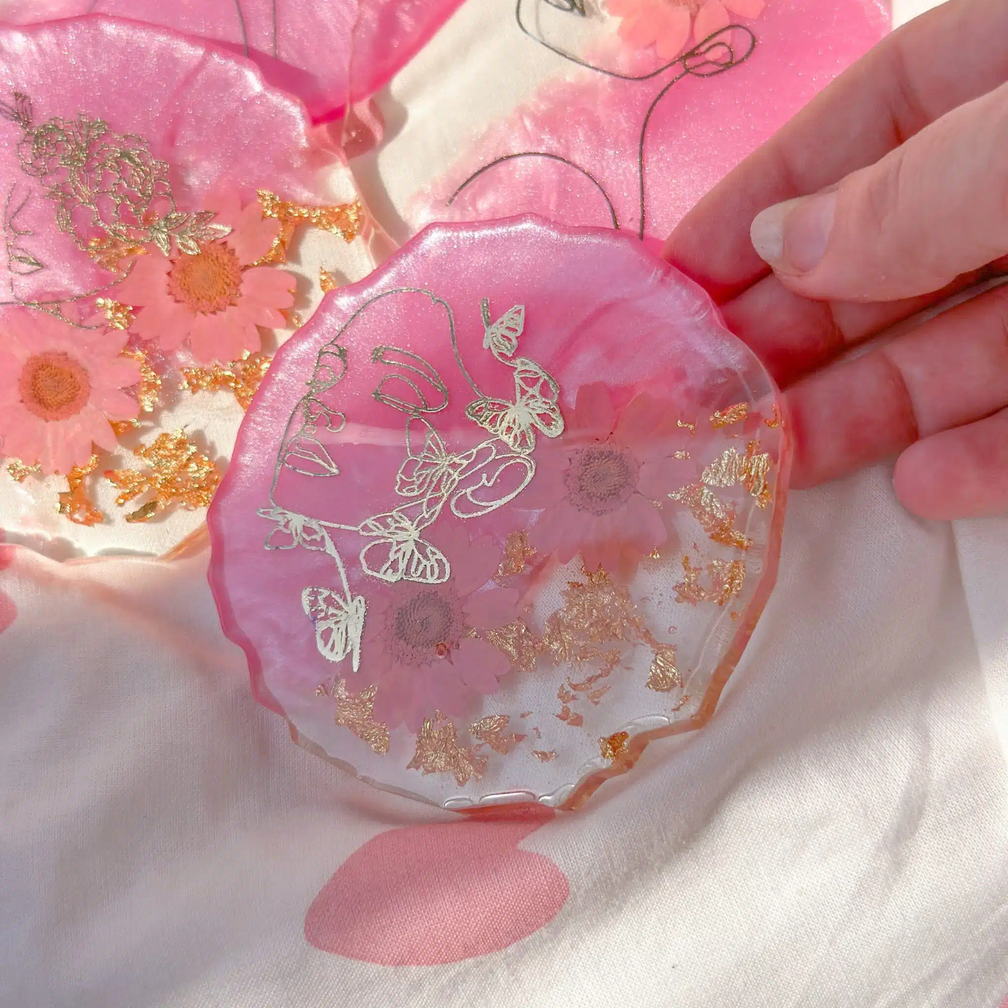 from shimmering blush-toned resin coaster set, adorned with real pressed florals, gold leaf flakes, and detailed line art celebrating the beauty of the female form.