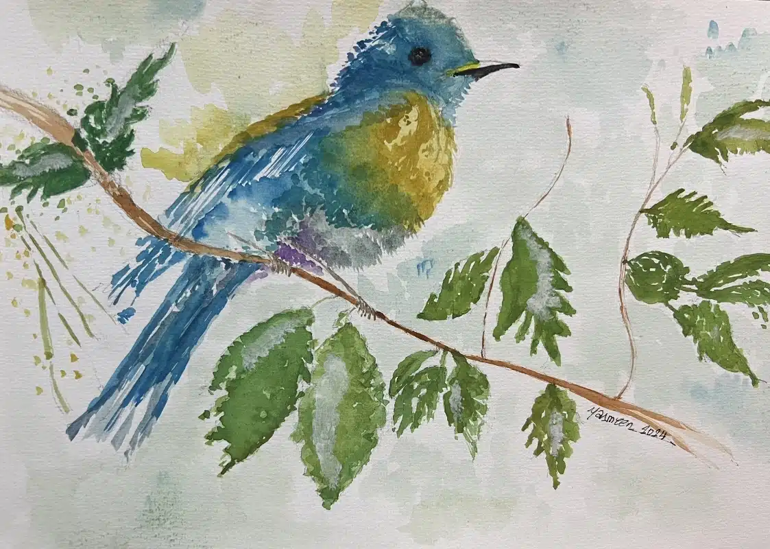 A colorful happy bird setting in between the branches. Sized: 21 x 31. Watercolor medium & the frame is customized