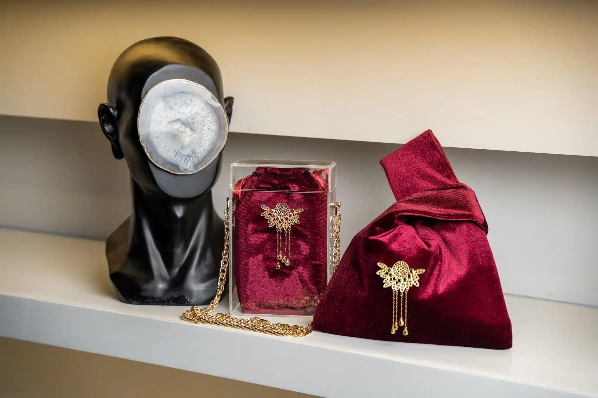 The Oxide Crystal Plexi Box, designed in an Acrylic Plexi Box Skeleton , with inside Velvet Tailored Pull-string Pouch with satin inside-lining, & our signature Gold-Plated Piece embedded with black and red color stones, by CH by Christine Habib Azer.