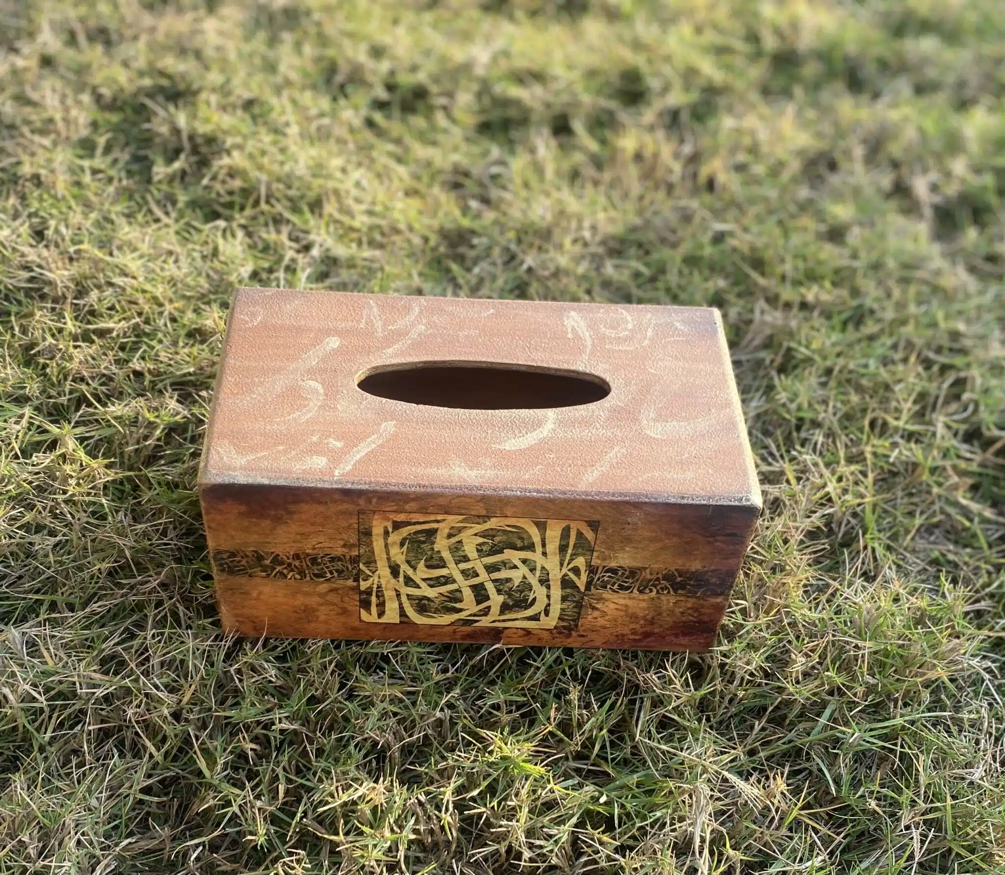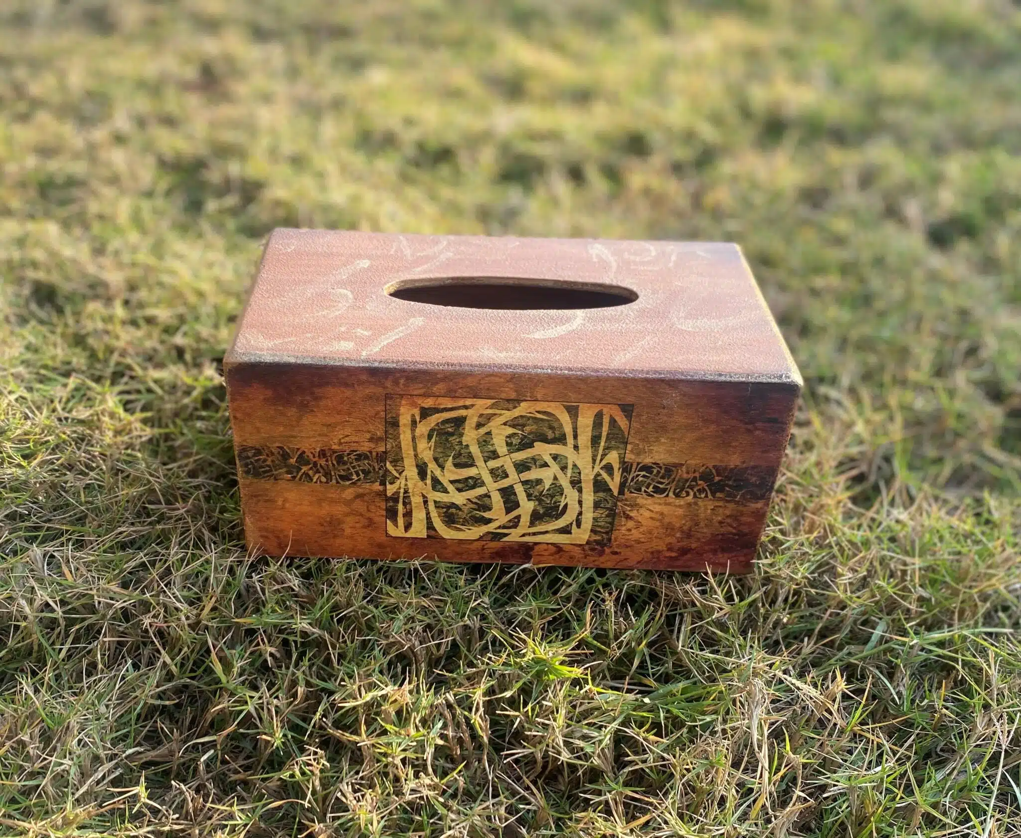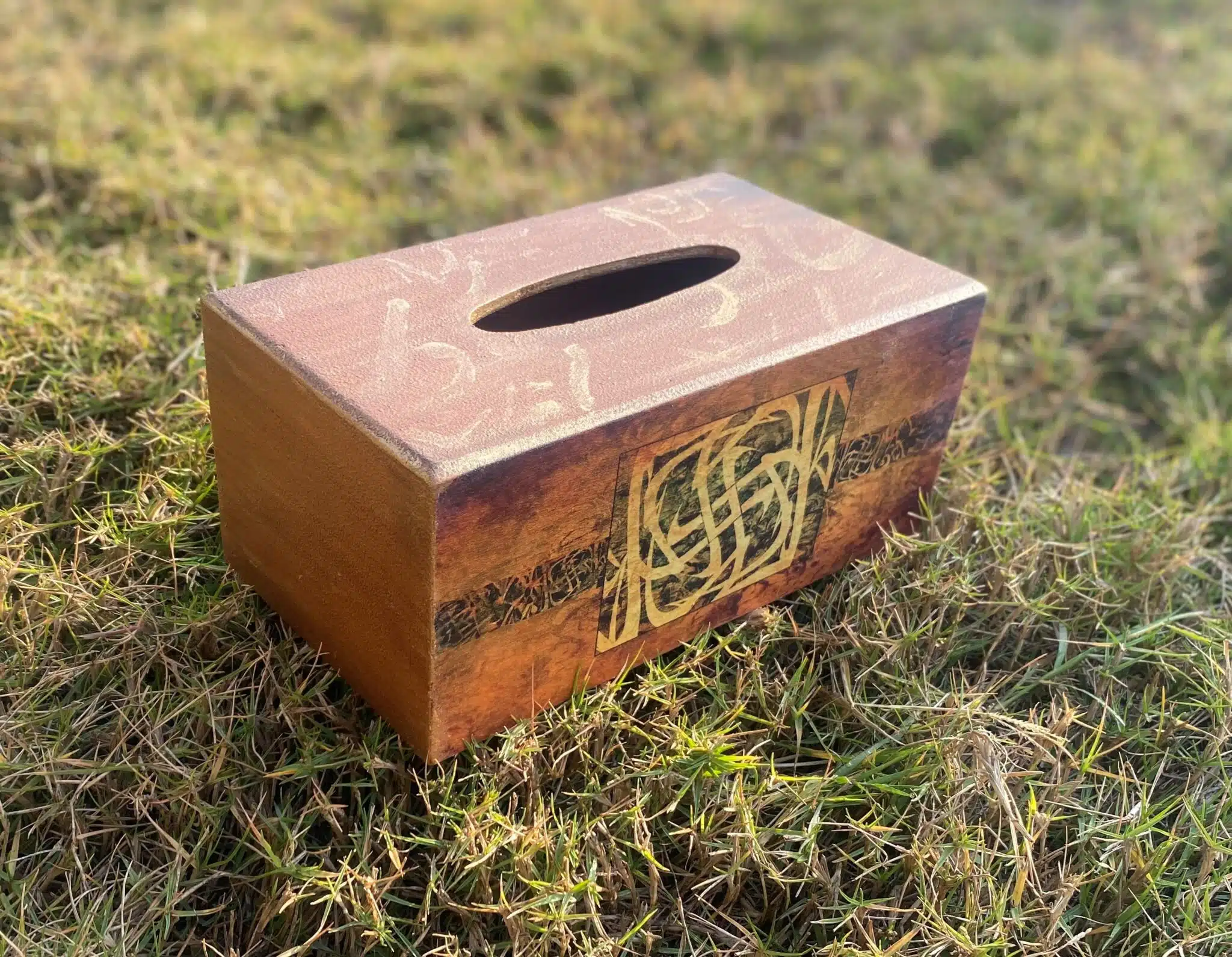 Wooden tissue box in brown terracotta color and Arabic calligraphy design with touches of gold