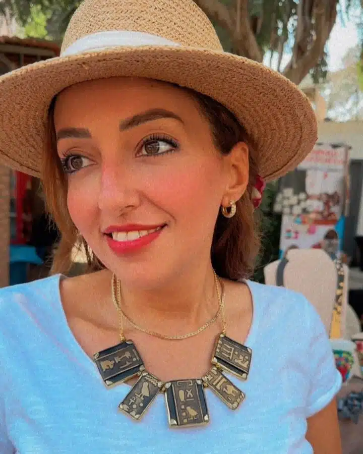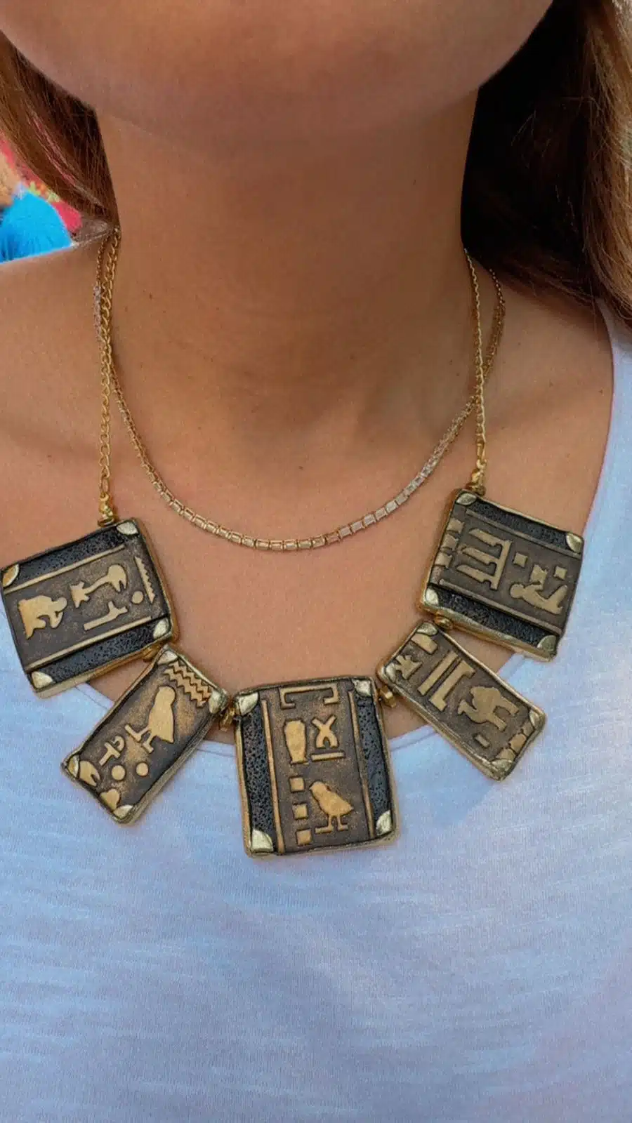 Handmade clay necklace featuring five rectangular pieces with hieroglyphic-inspired designs, connected by a golden chain. Unique and artistic, perfect for adding a special touch to any outfit. Ideal for gifts or daily wear. Experience the charm of Egyptian craftsmanship!