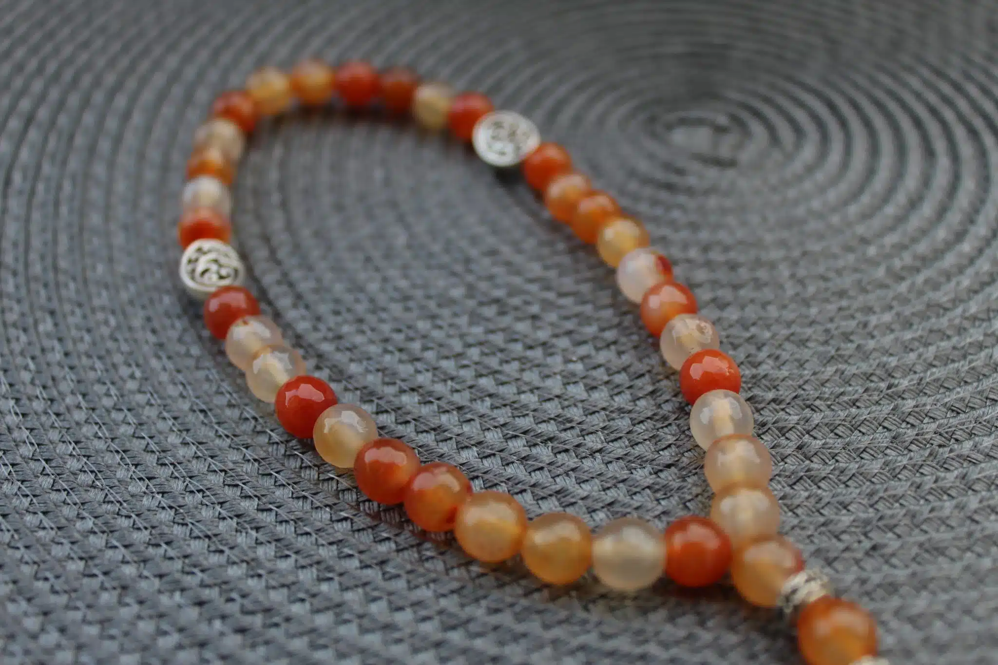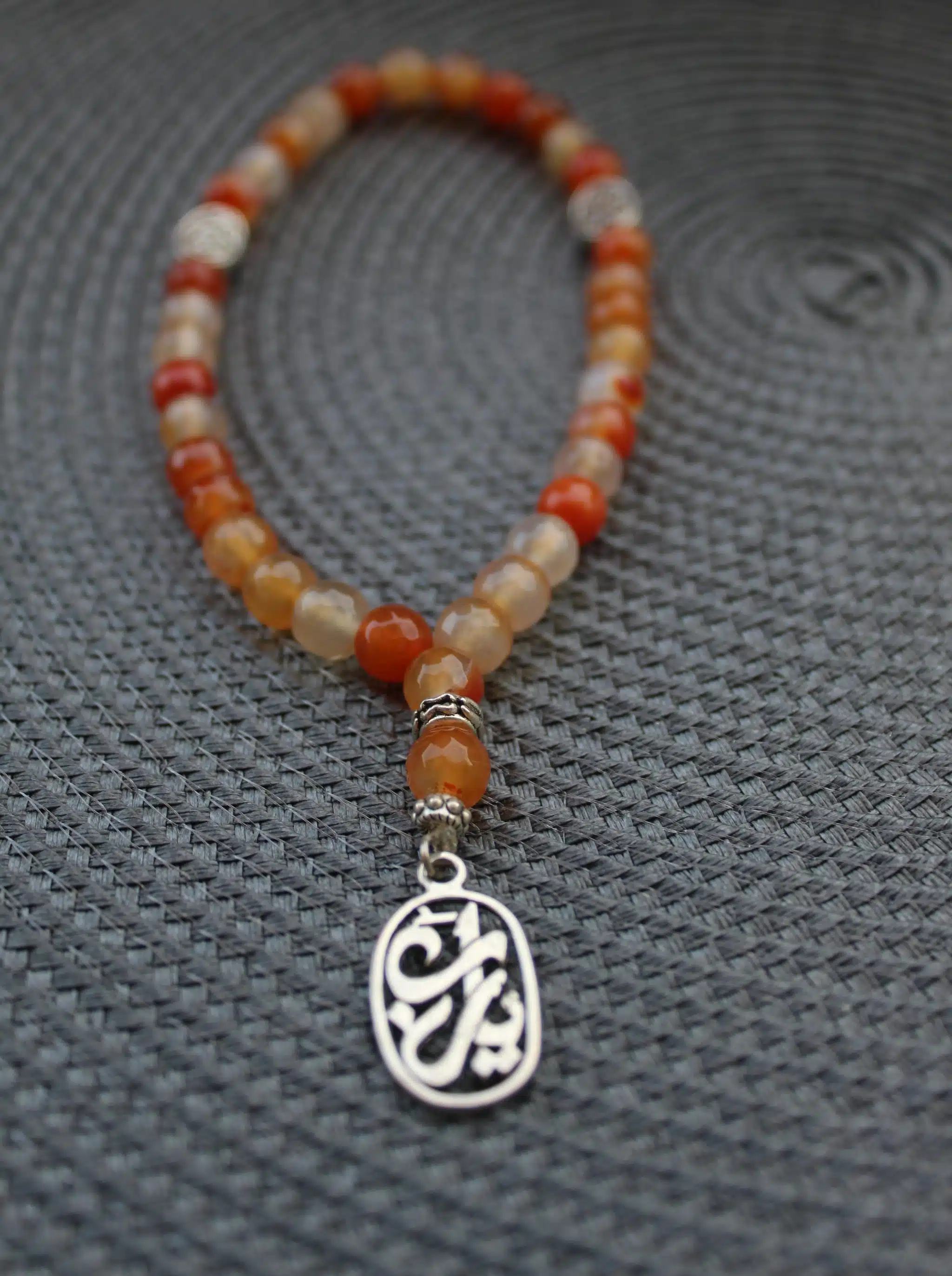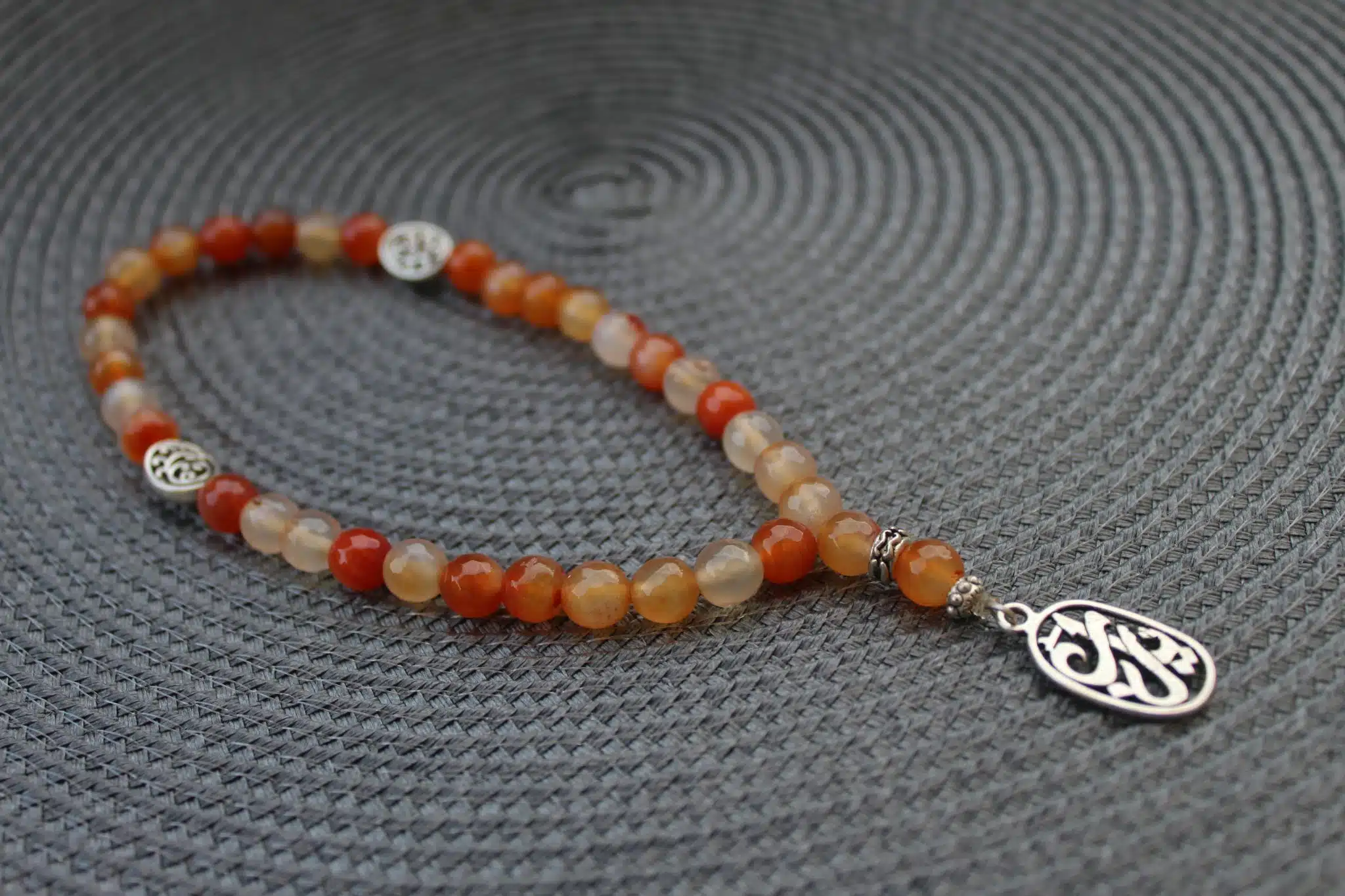 33 light orange shades stones sebha size 8 with silver color charm and space beads
