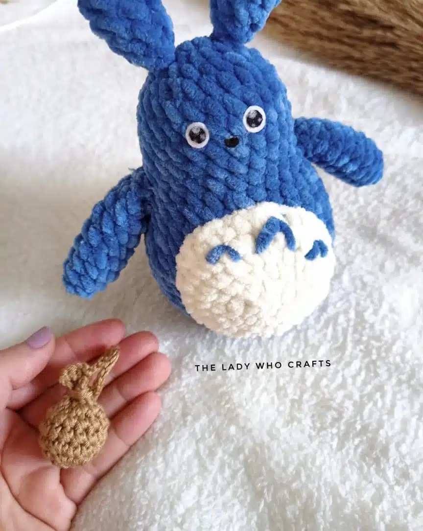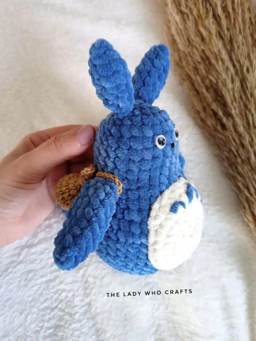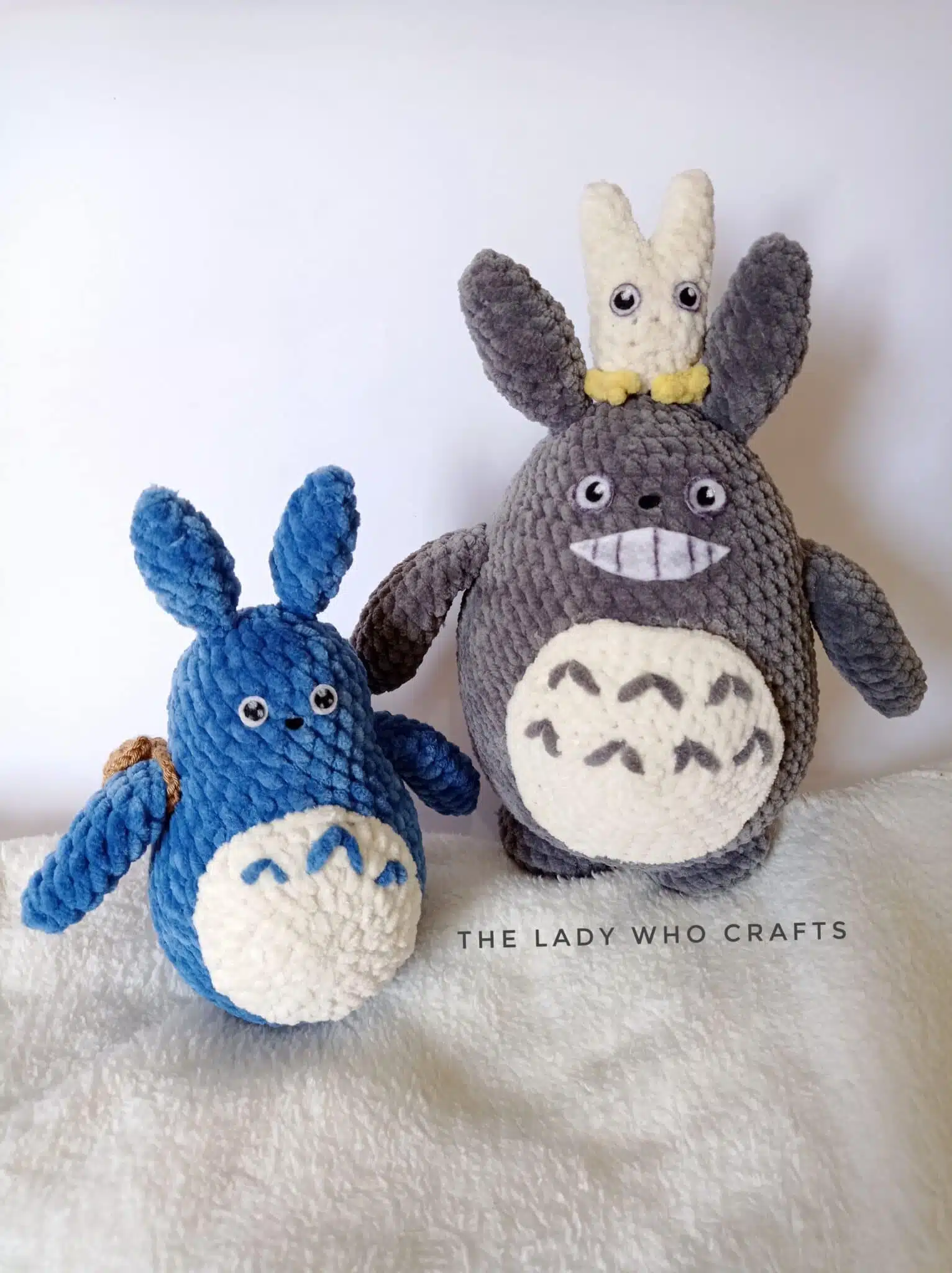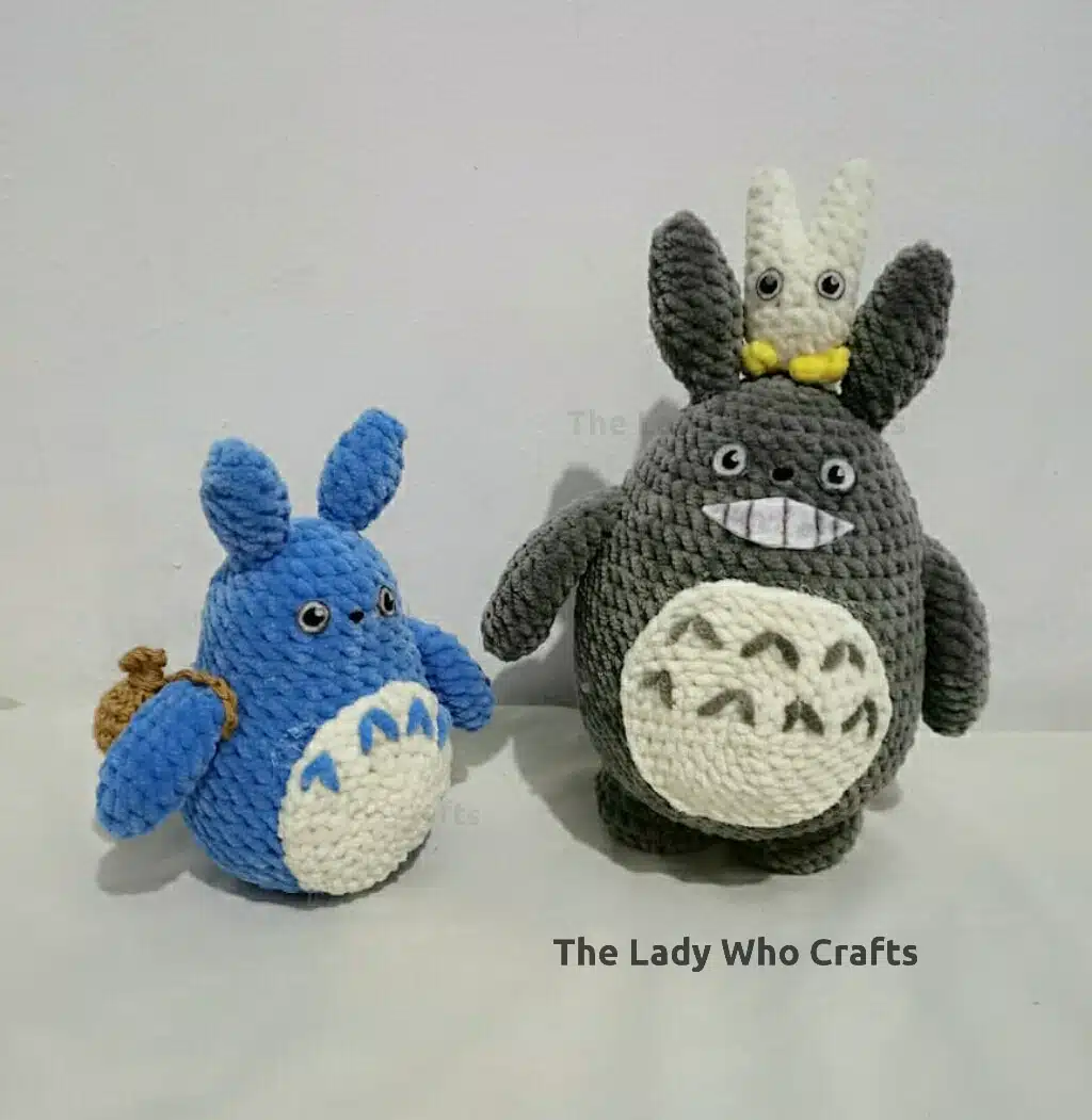 Amigurumi set of 3 velvet totoros, gray, blue, and white.