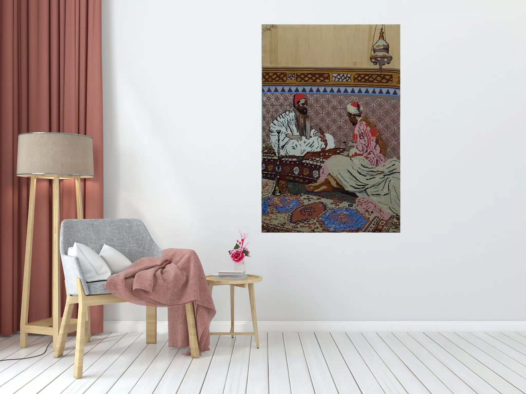 This artwork captures an intimate and traditional Middle Eastern scene, showcasing two individuals engaged in conversation in a detailed, richly textured setting. The intricate patterns on the walls and rugs, combined with the vibrant tones of the clothing and décor, reflect the beauty and culture of heritage storytelling through textiles. Perfect for adding depth and cultural richness to any interior.
