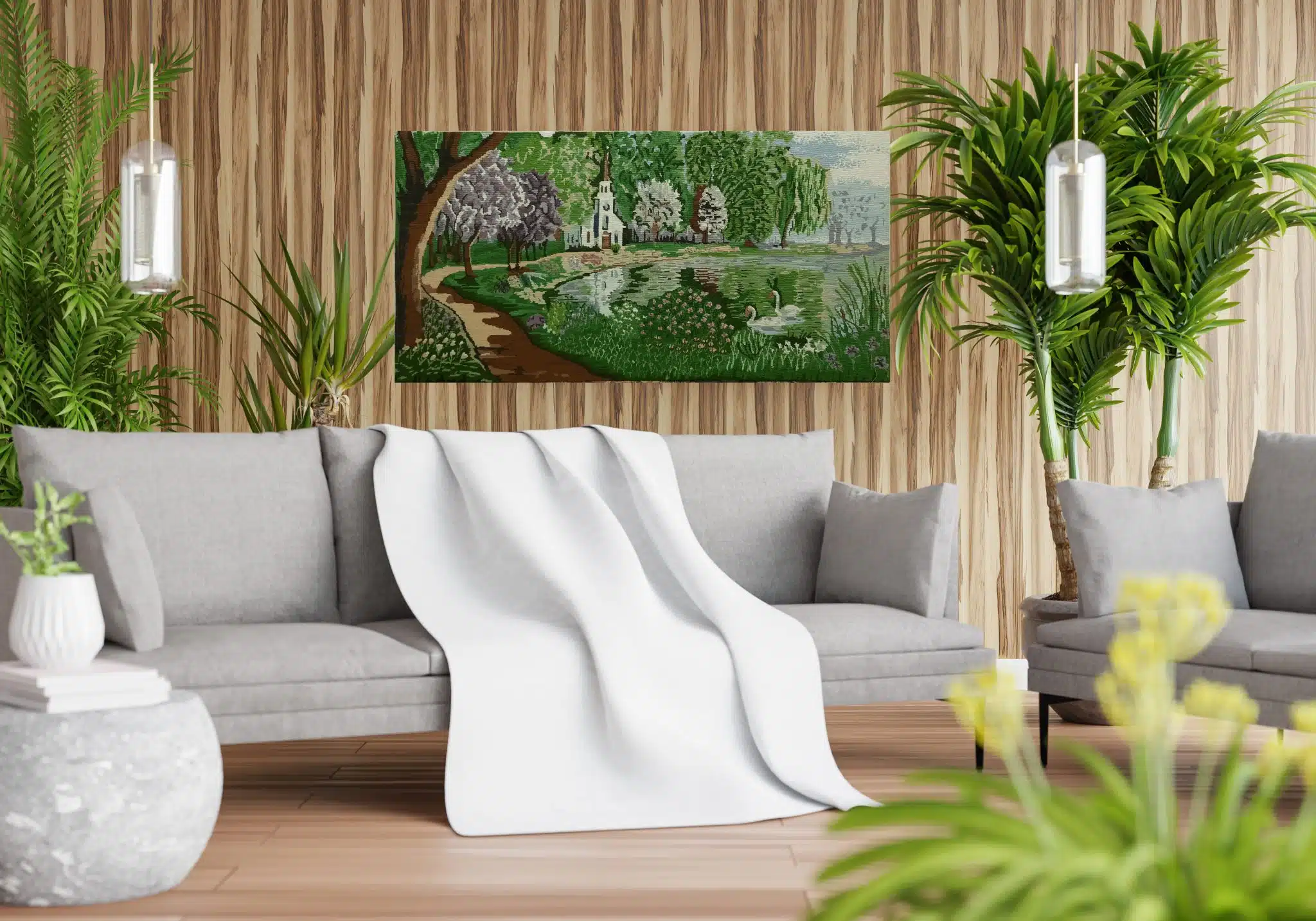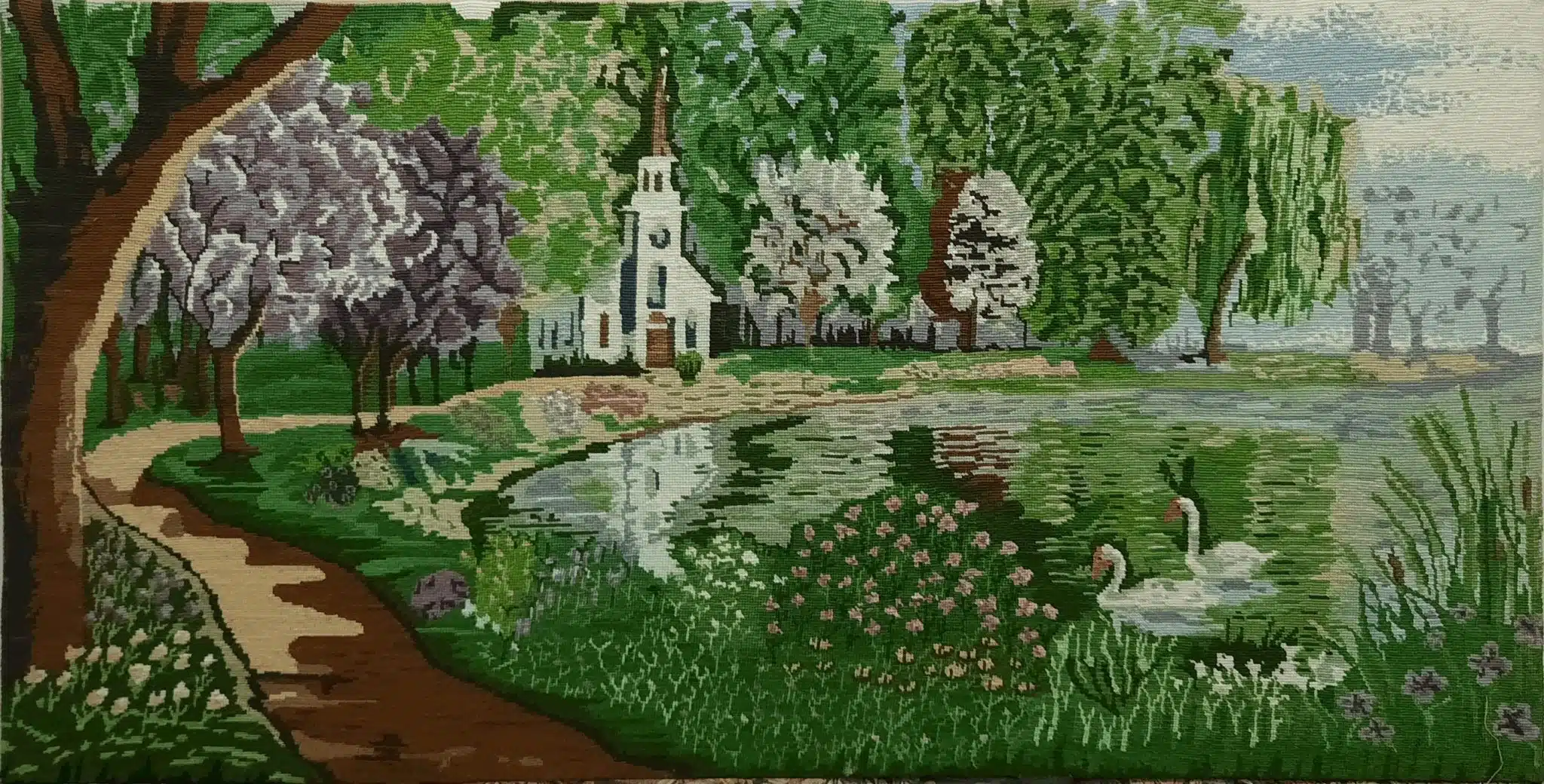 Step into a serene and idyllic landscape with this beautifully handcrafted canvas. This artwork captures a picturesque spring garden adorned with blooming trees, a quaint white chapel, and graceful swans gliding across a tranquil pond. The intricate stitching and vibrant natural hues evoke a sense of peace and harmony, making it a perfect representation of nature’s beauty.