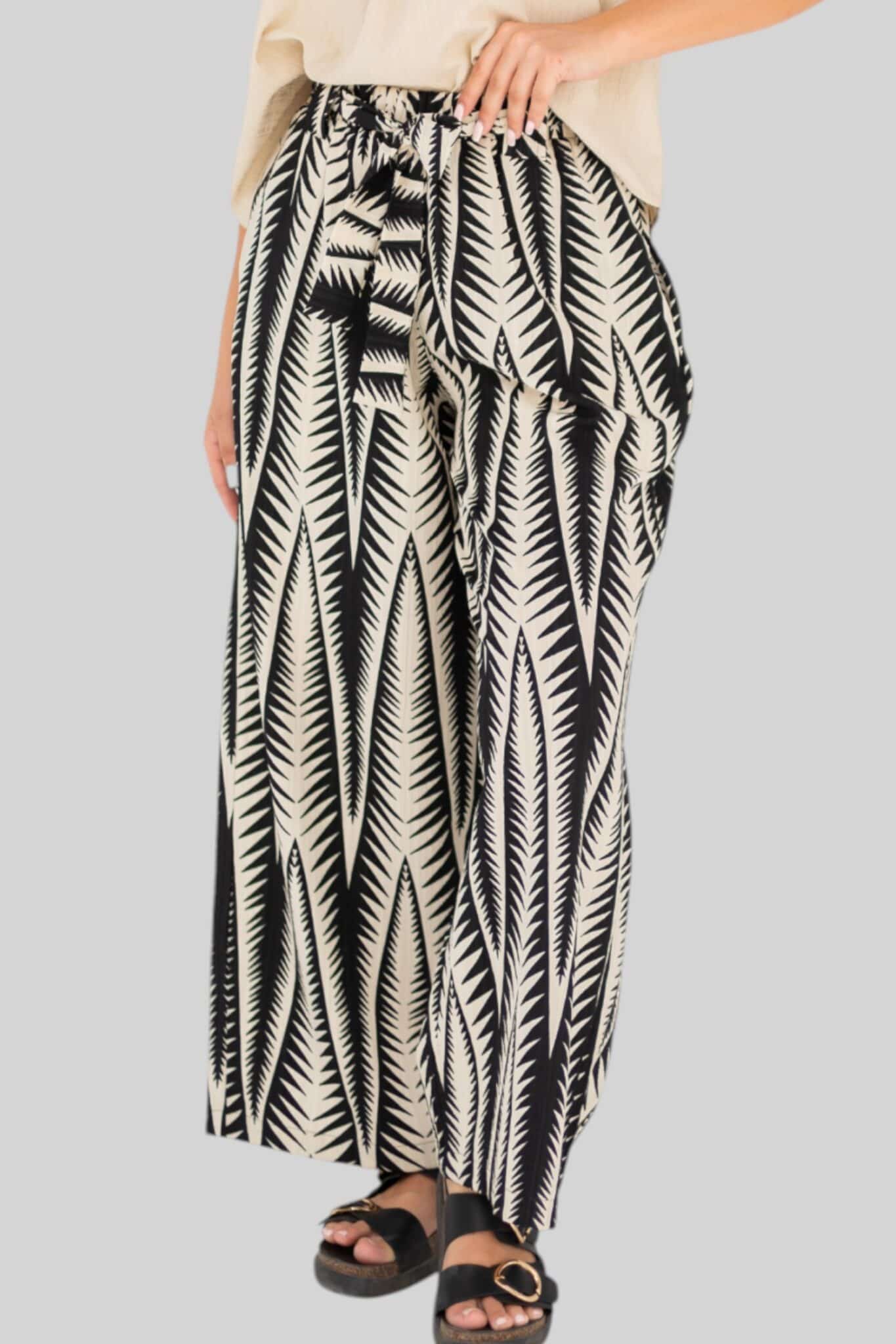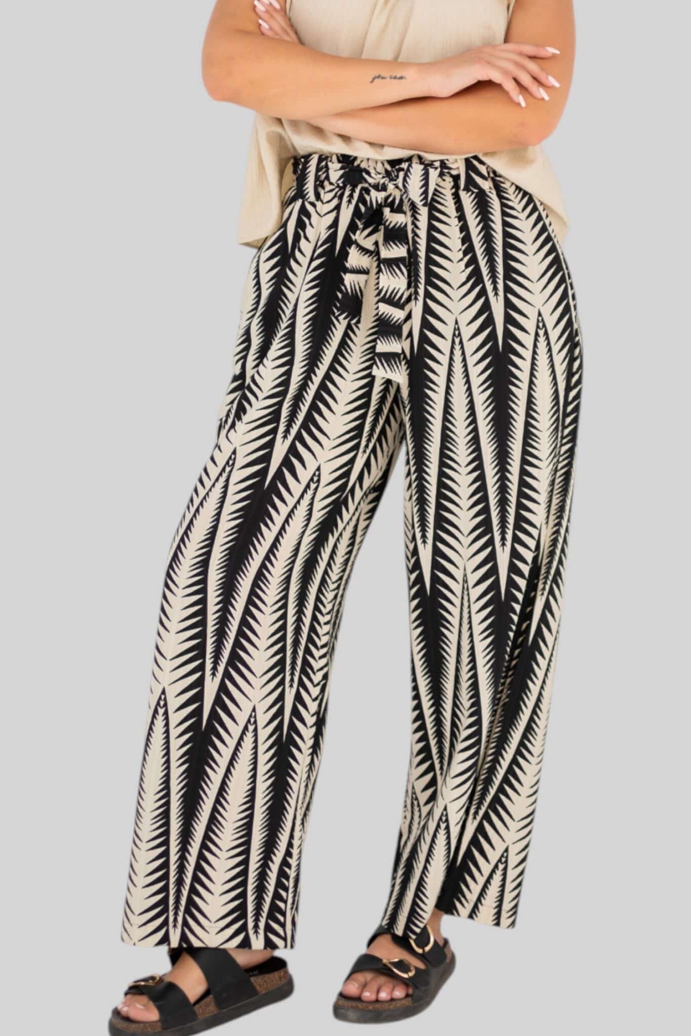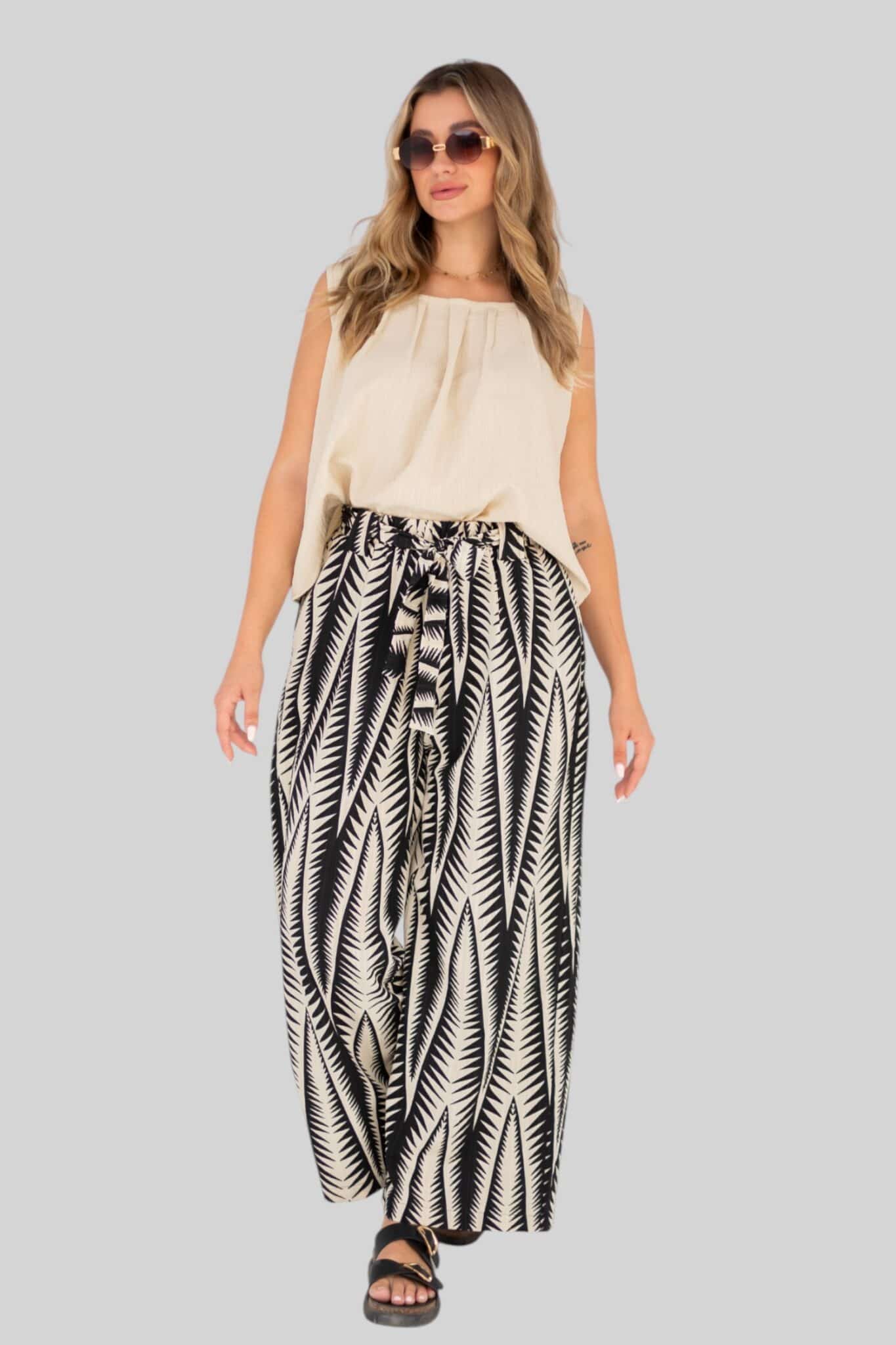 loose pants with elastic waist, belt and pockets