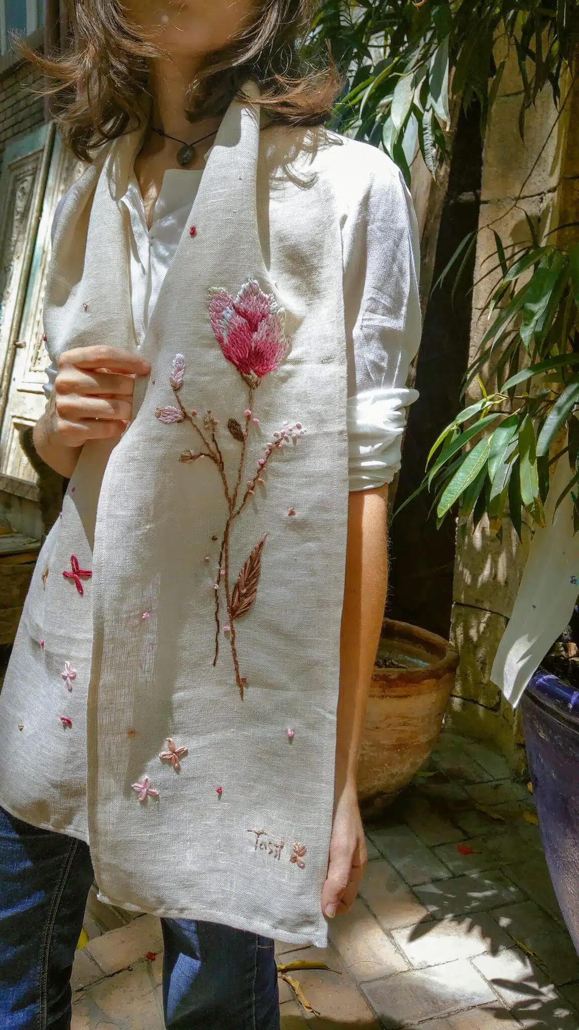 Beige linen scarf with handmade embroidery. Sice 20*180