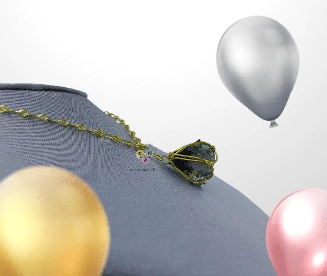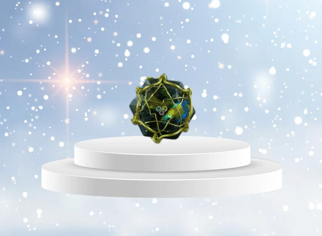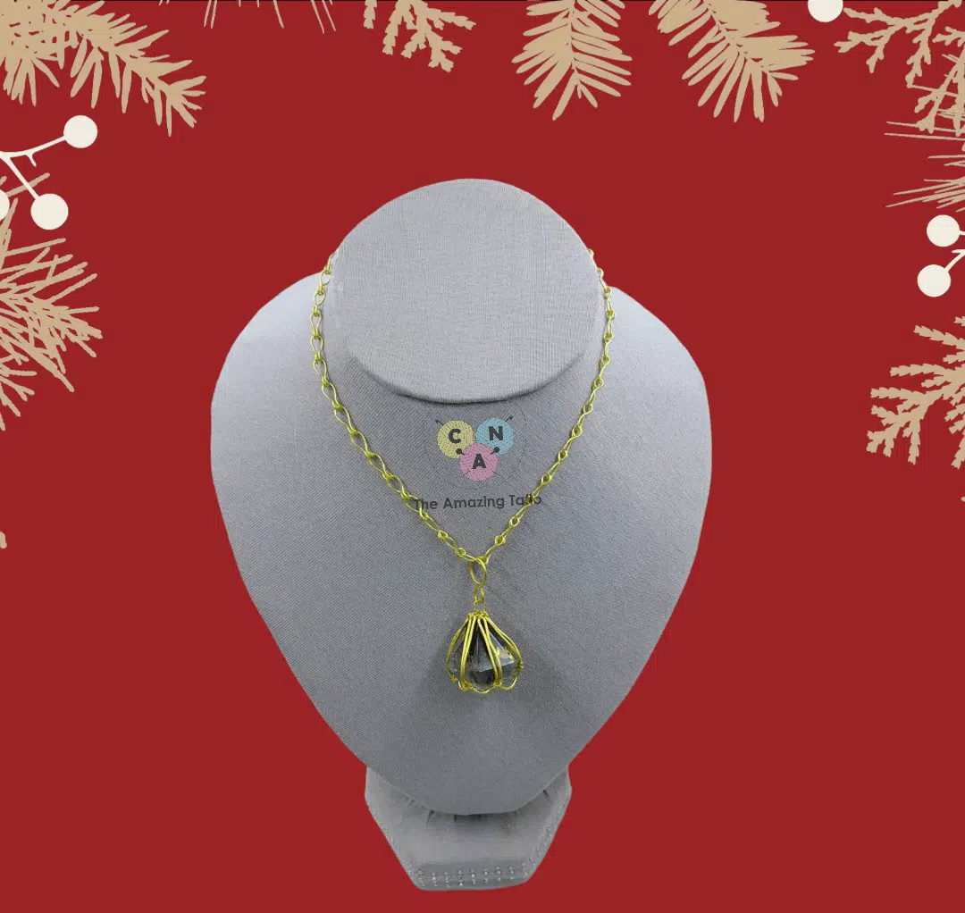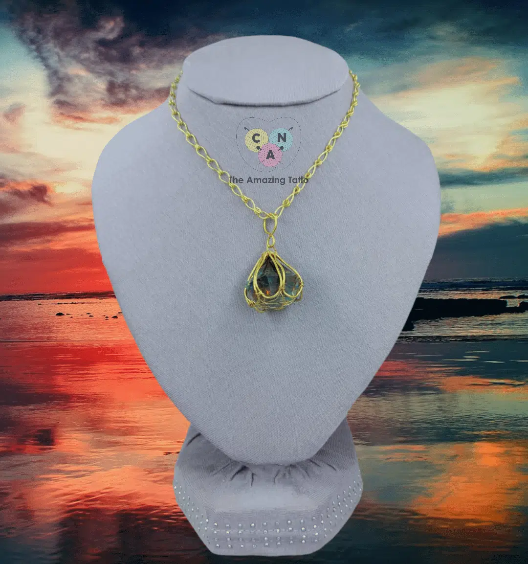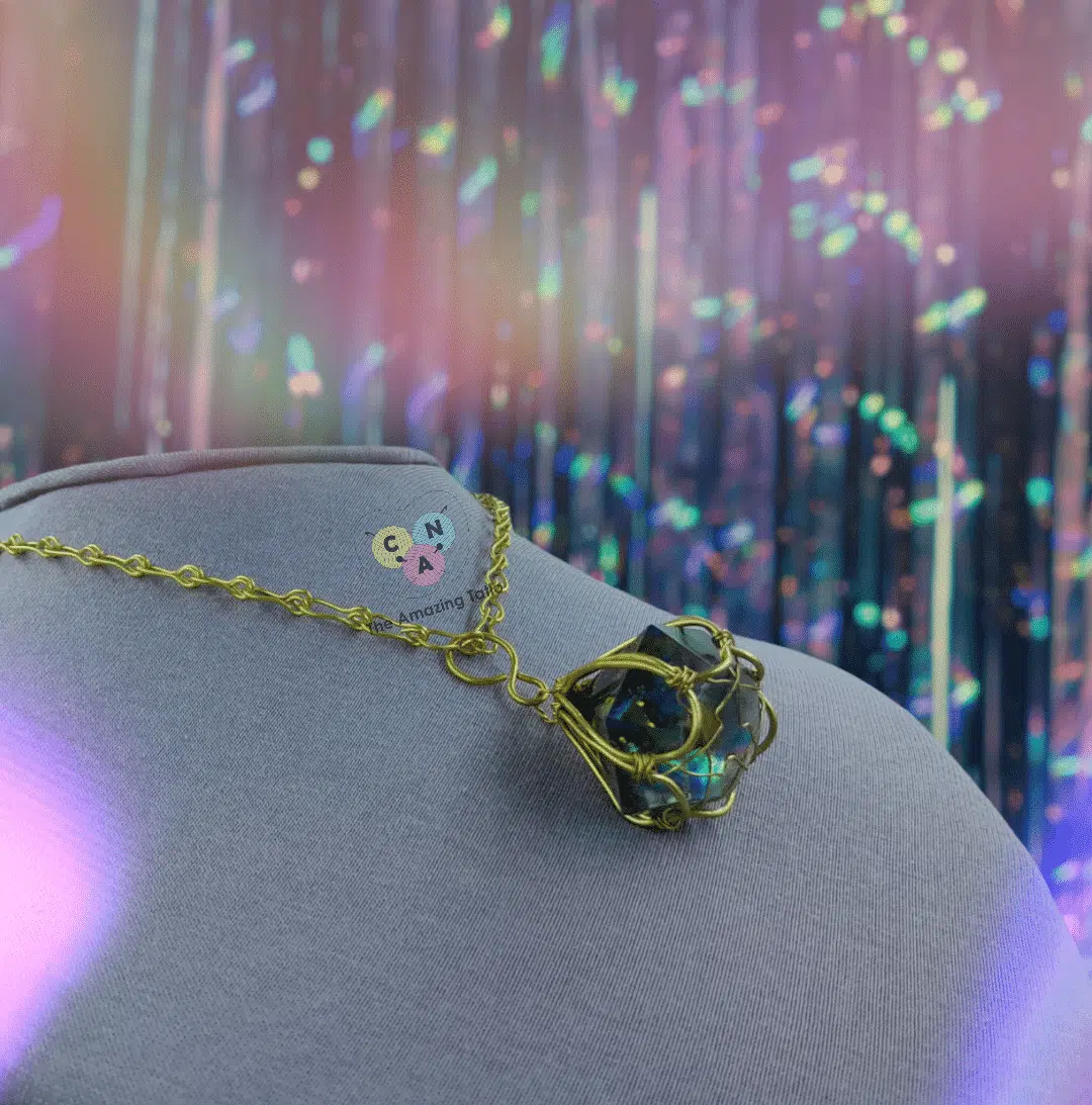 material: crystal stone ( from epoxy resin contain sparkle sheets changing its color by light ) – surround with ( pure yellow copper wire wrapping handmade, shaped like tulip flower )
