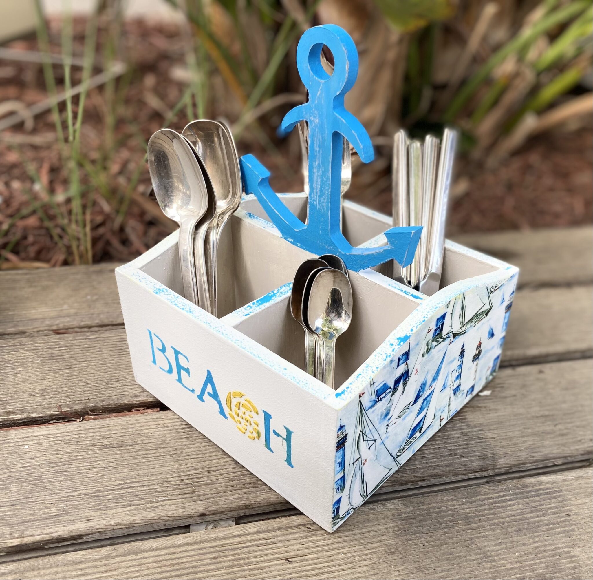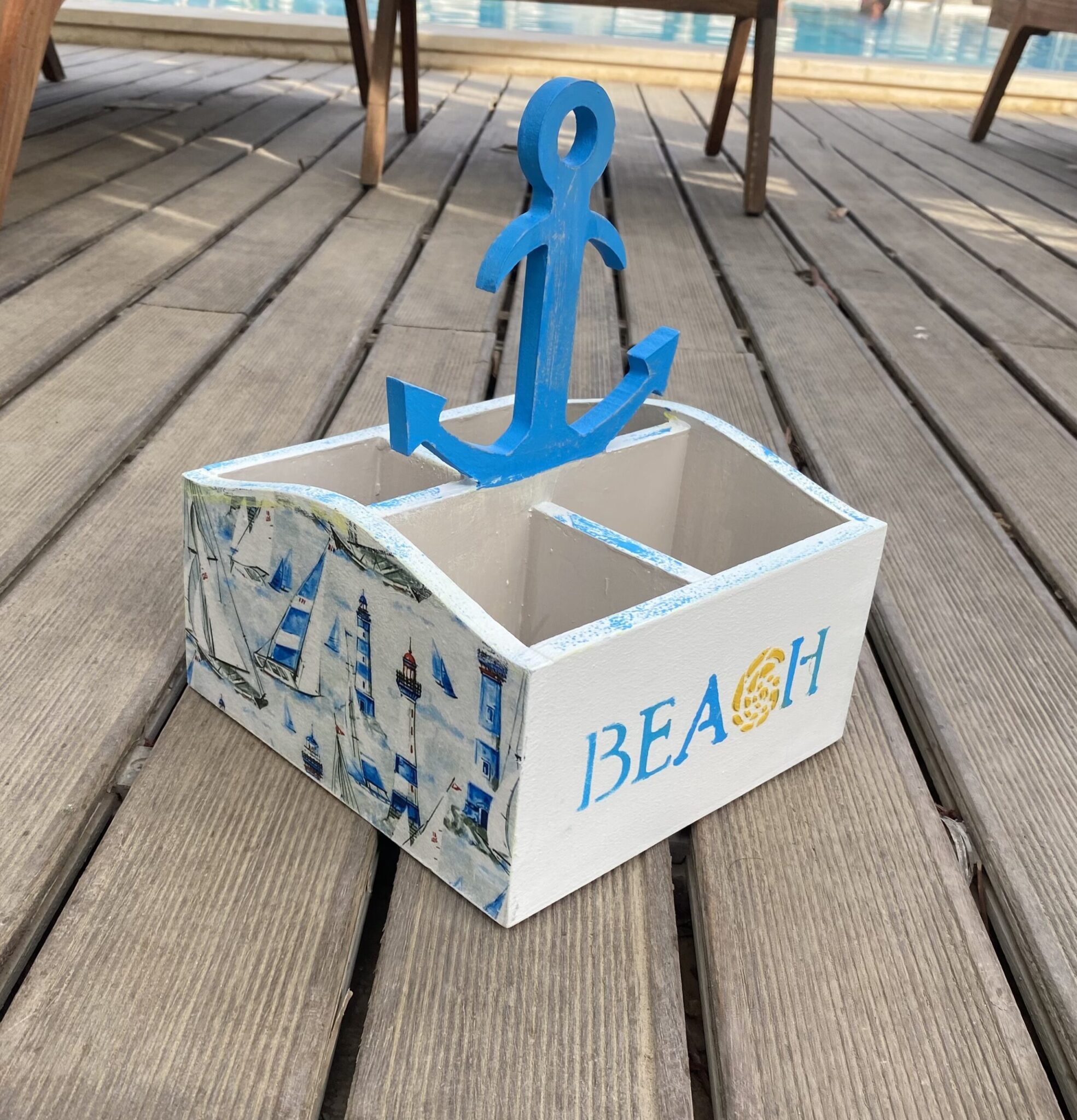 Wooden Summer Anchor Cutlery Organizer in Turquoise color