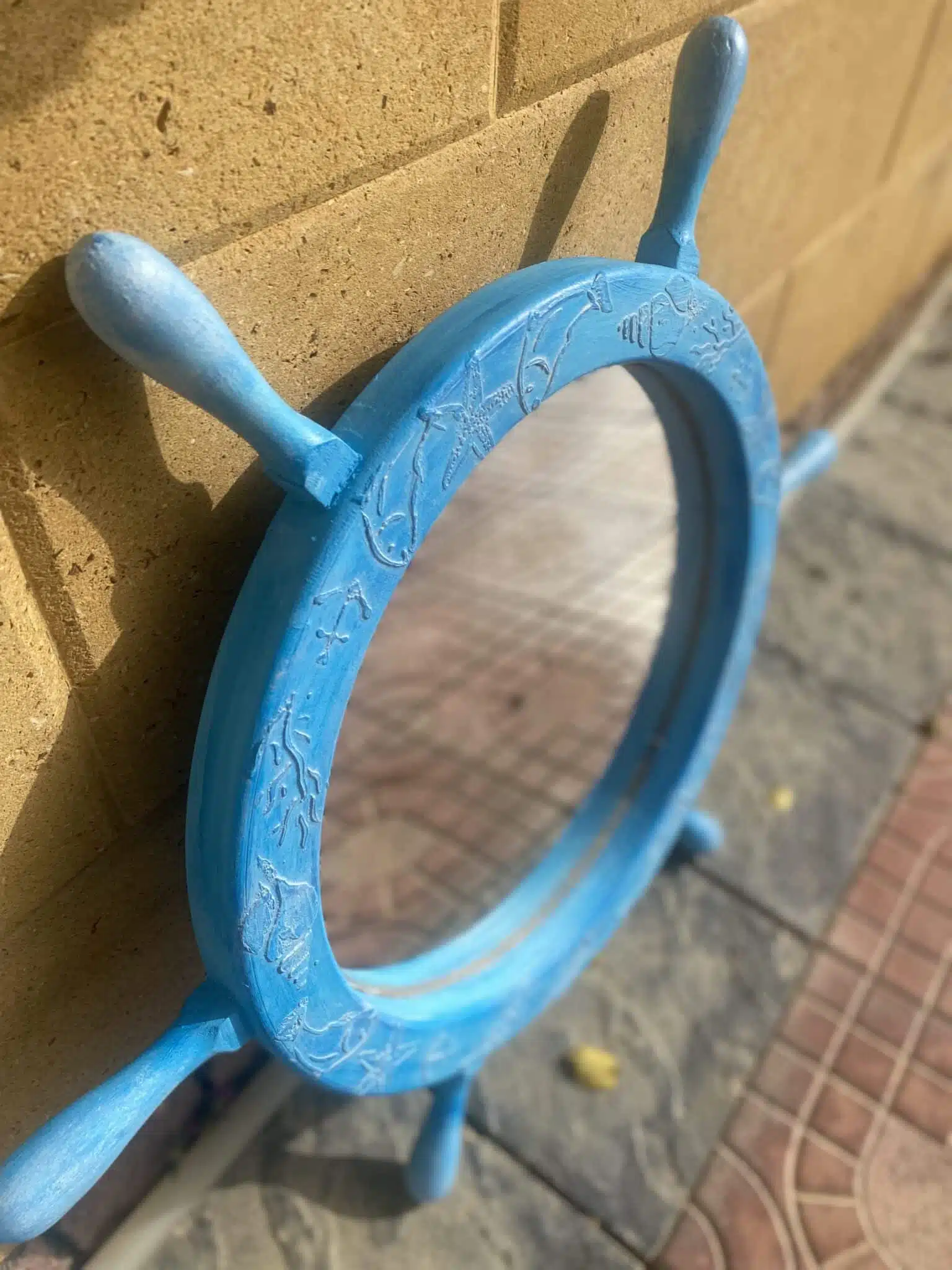 Wooden summer wheel mirror in turquoise color