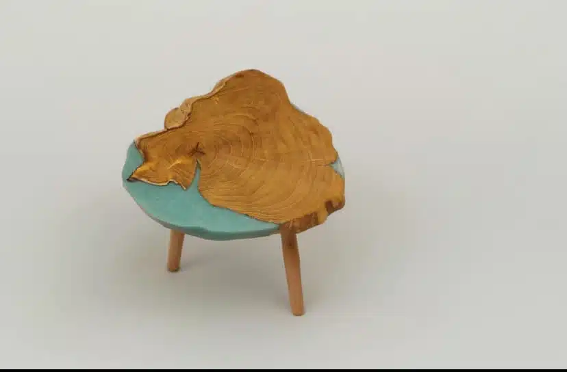Unshaped side table wood with Turquoise Epoxi Dimension : L55*W50*H40 cm wooden Leg. We custmize, each piece is a unique piece