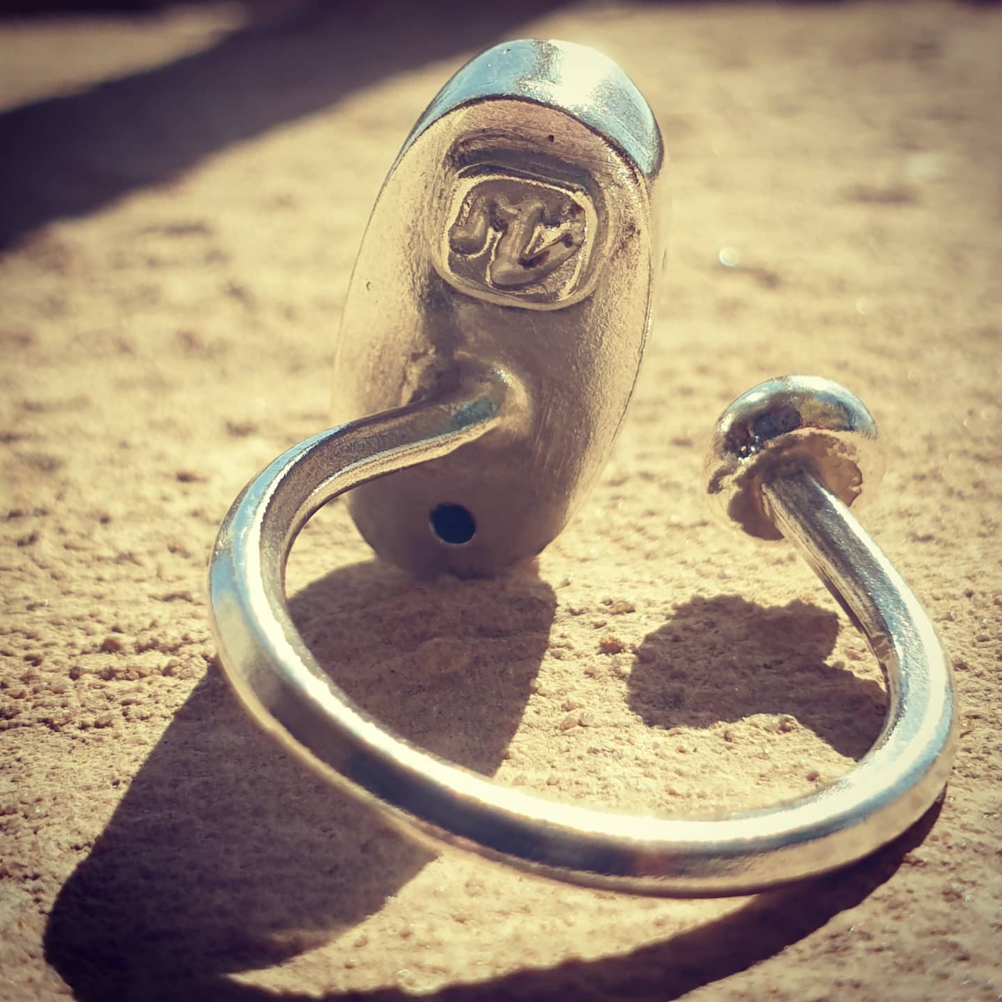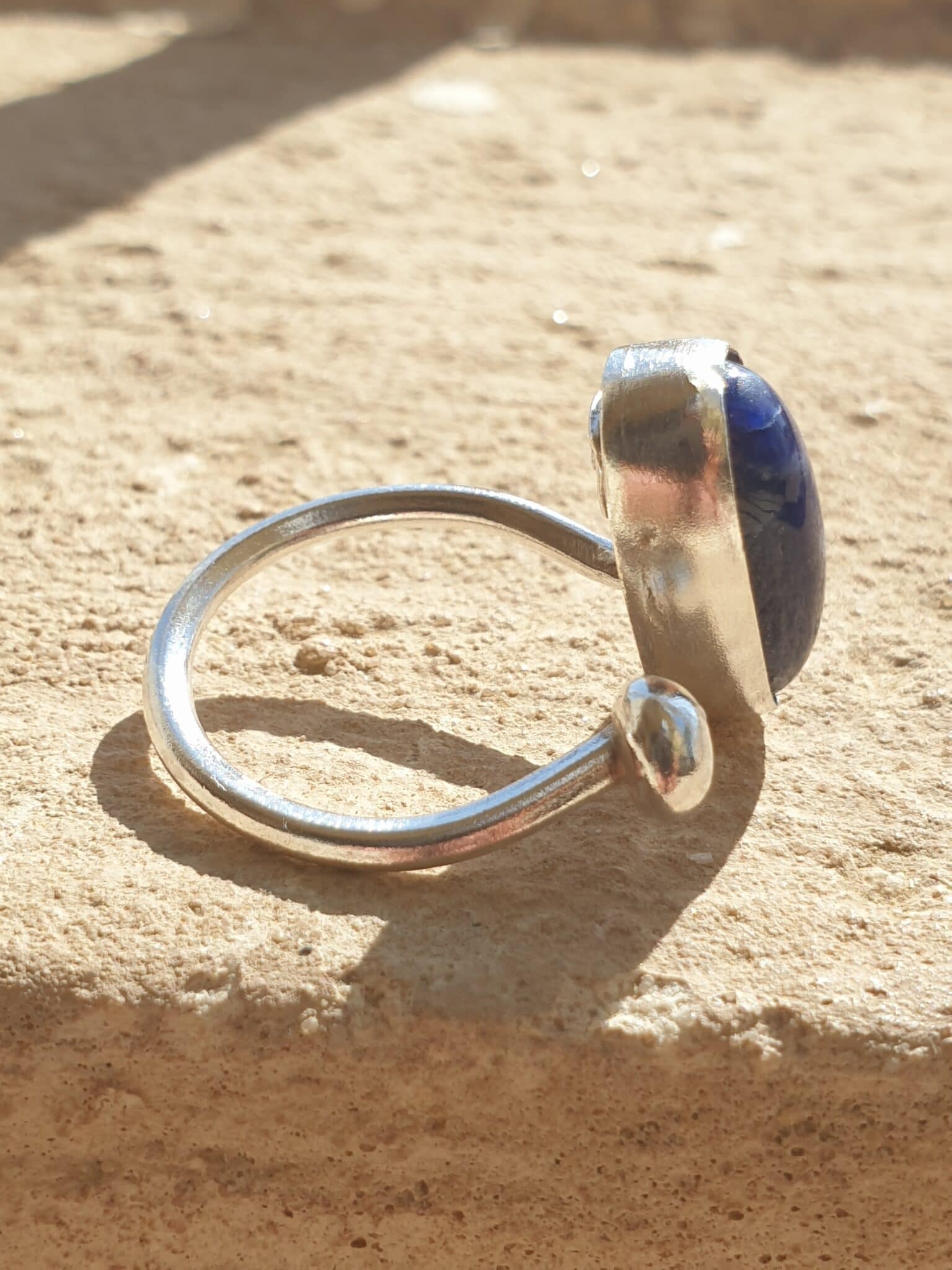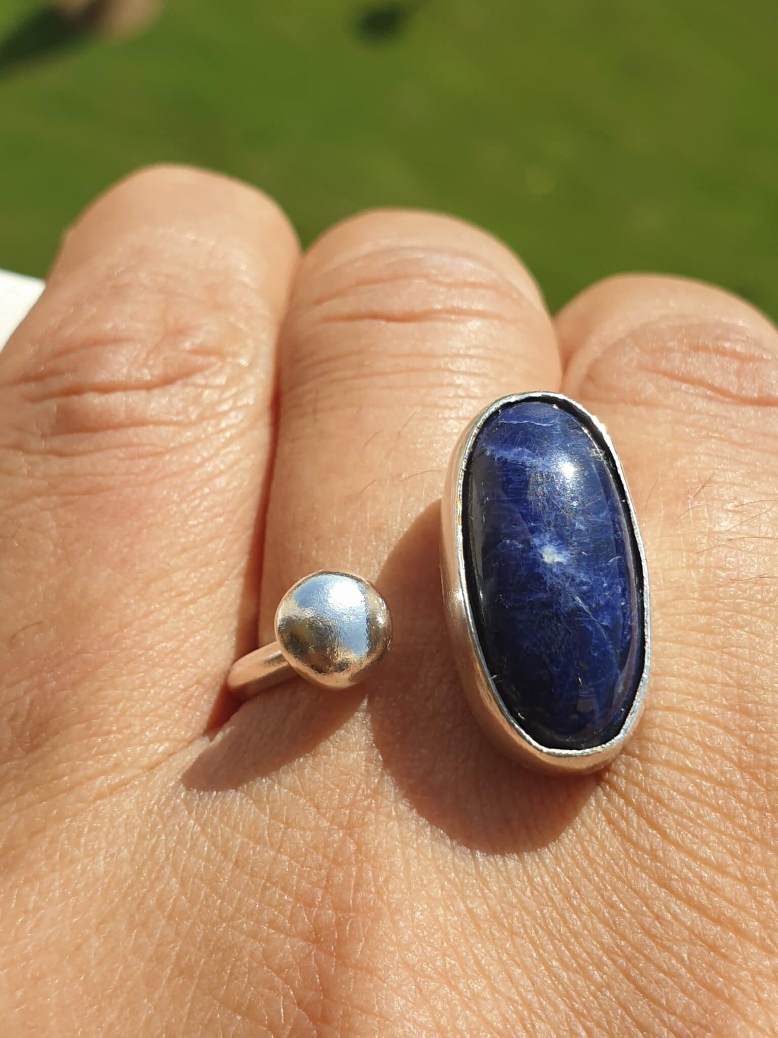 Open end sterling silver ring with sodalite stone on one end and a silver ball on the other. Please note that each piece of jewelry is one of a kind and cannot be repeated exactly the same way. New orders will be different in stones and/or a small design aspect. New orders take from 7 to 10 days to recreate. All items are fully customizable and can be done in silver or brass.