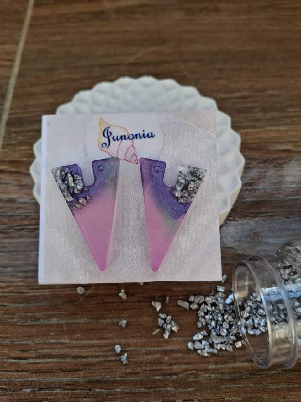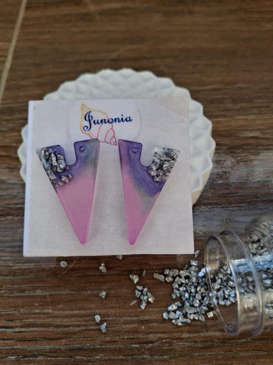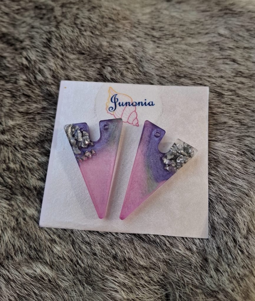 Triangular Resin Earrings. Pink color with touch of purple and silver.