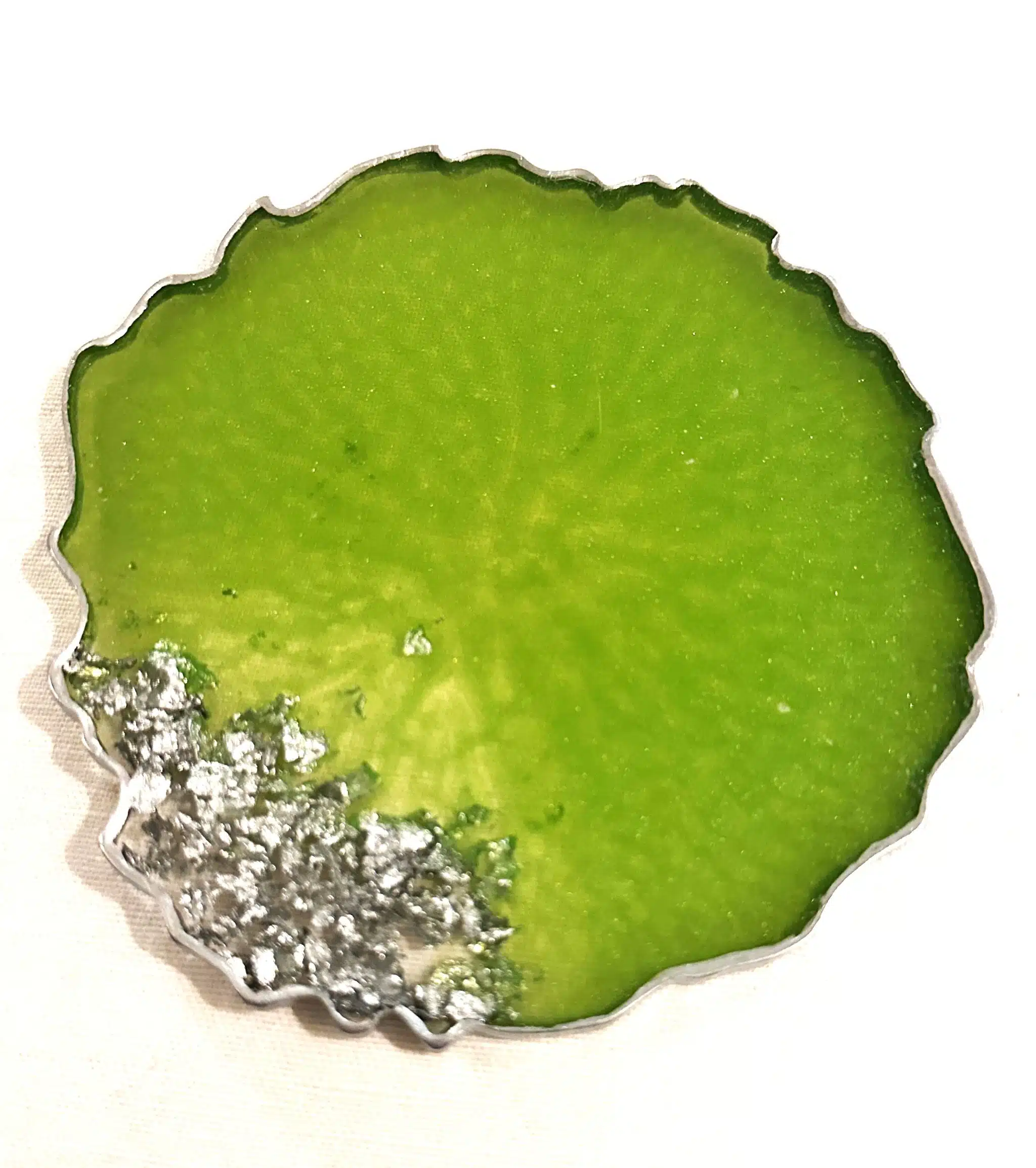 Round vibrant green and transparent resin coasters with gold or silver leaves. It’s size is around 13 cm.