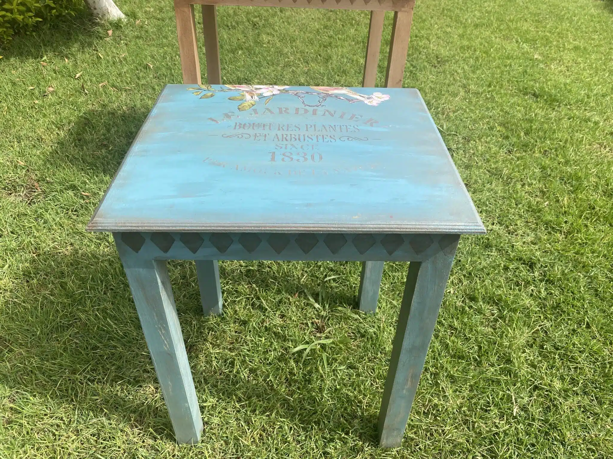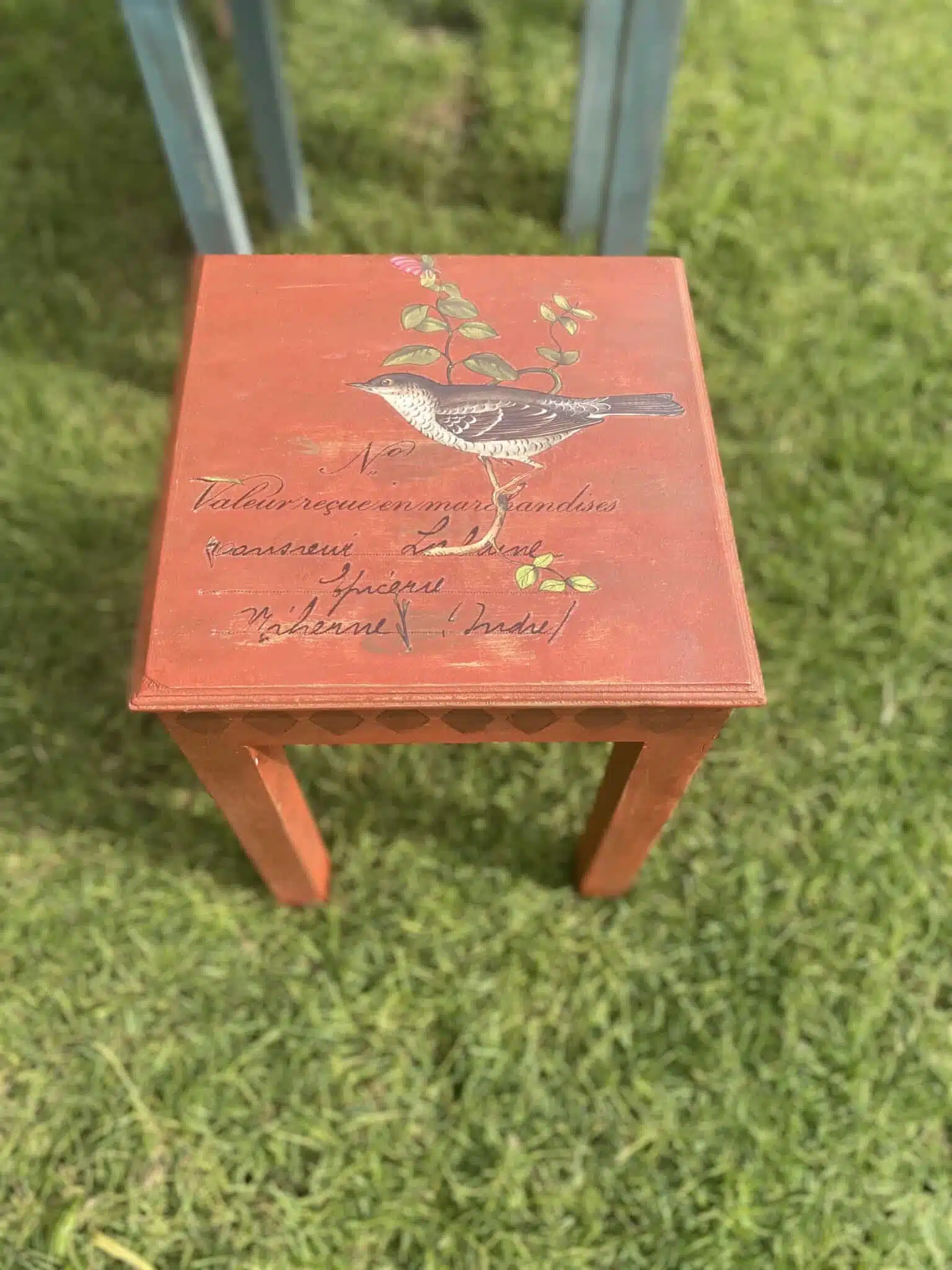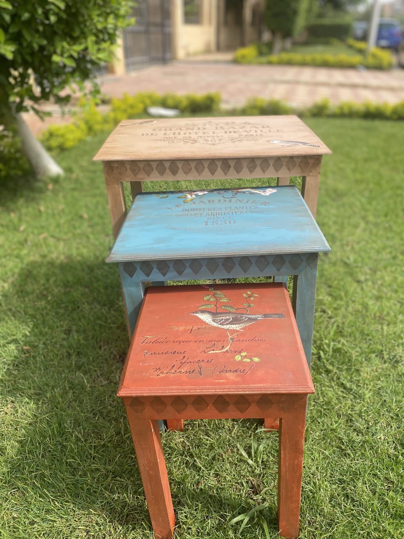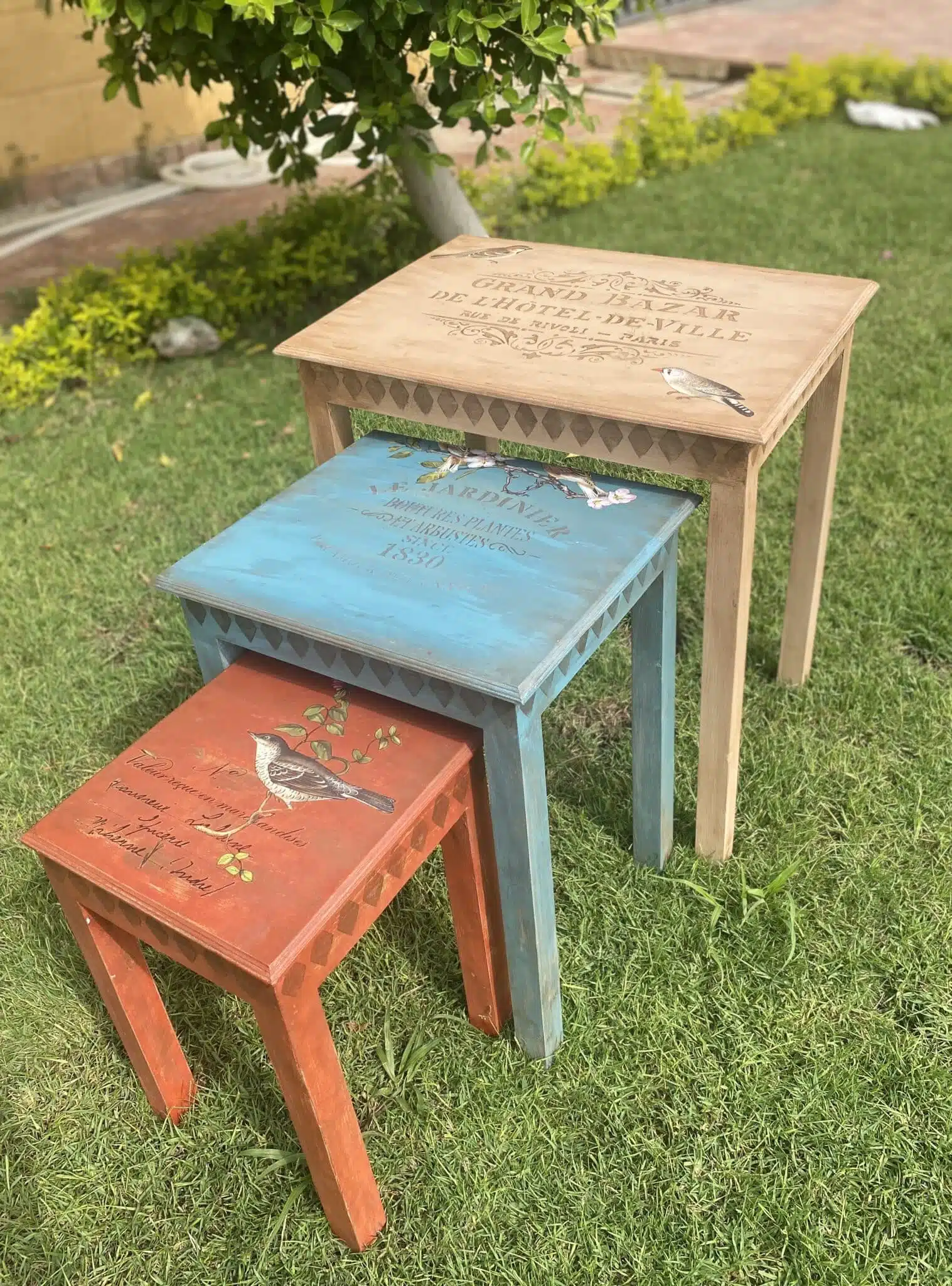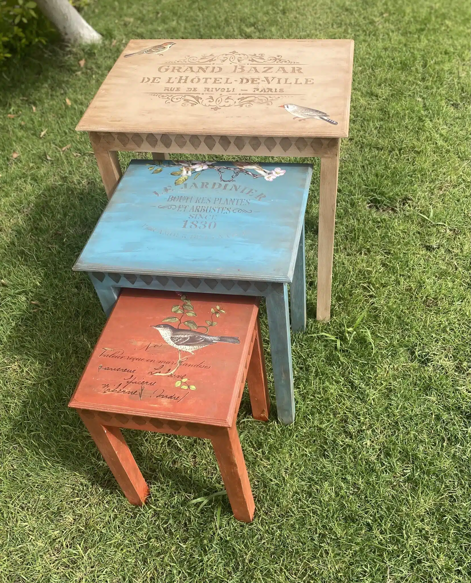 Wooden Side Tables in warm colors with vintage birds transfer