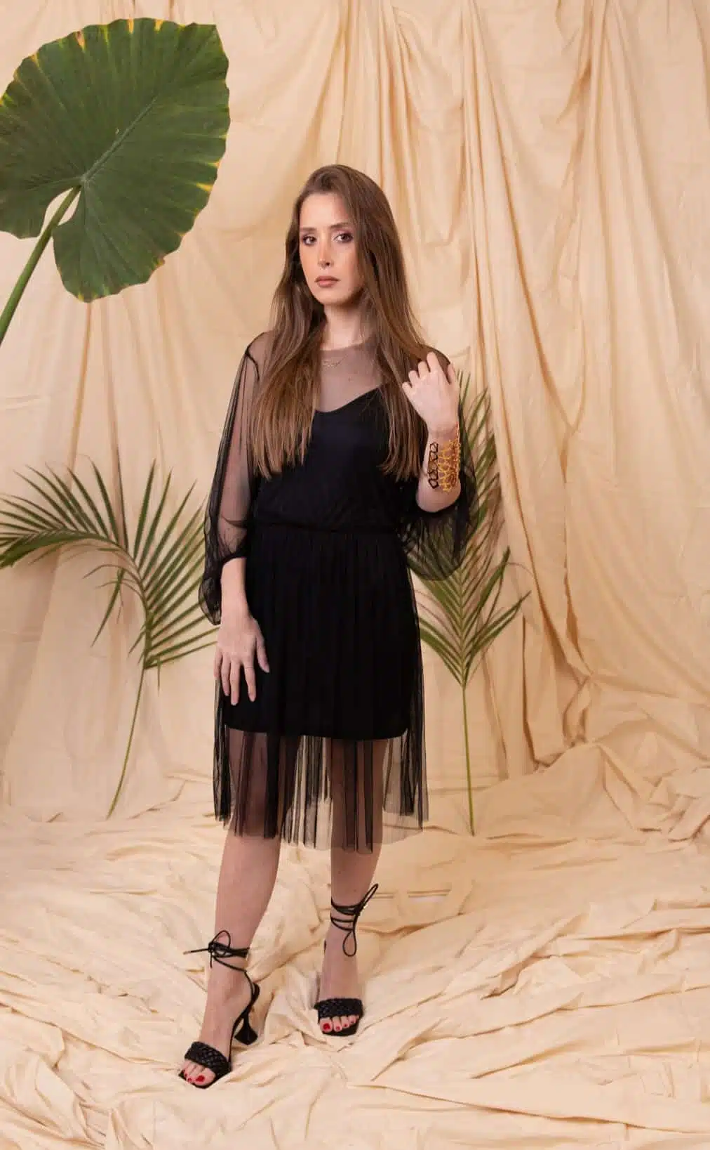 - Featuring Round neck tulle with 3/4 puffed sleeve + short basic viscose dress