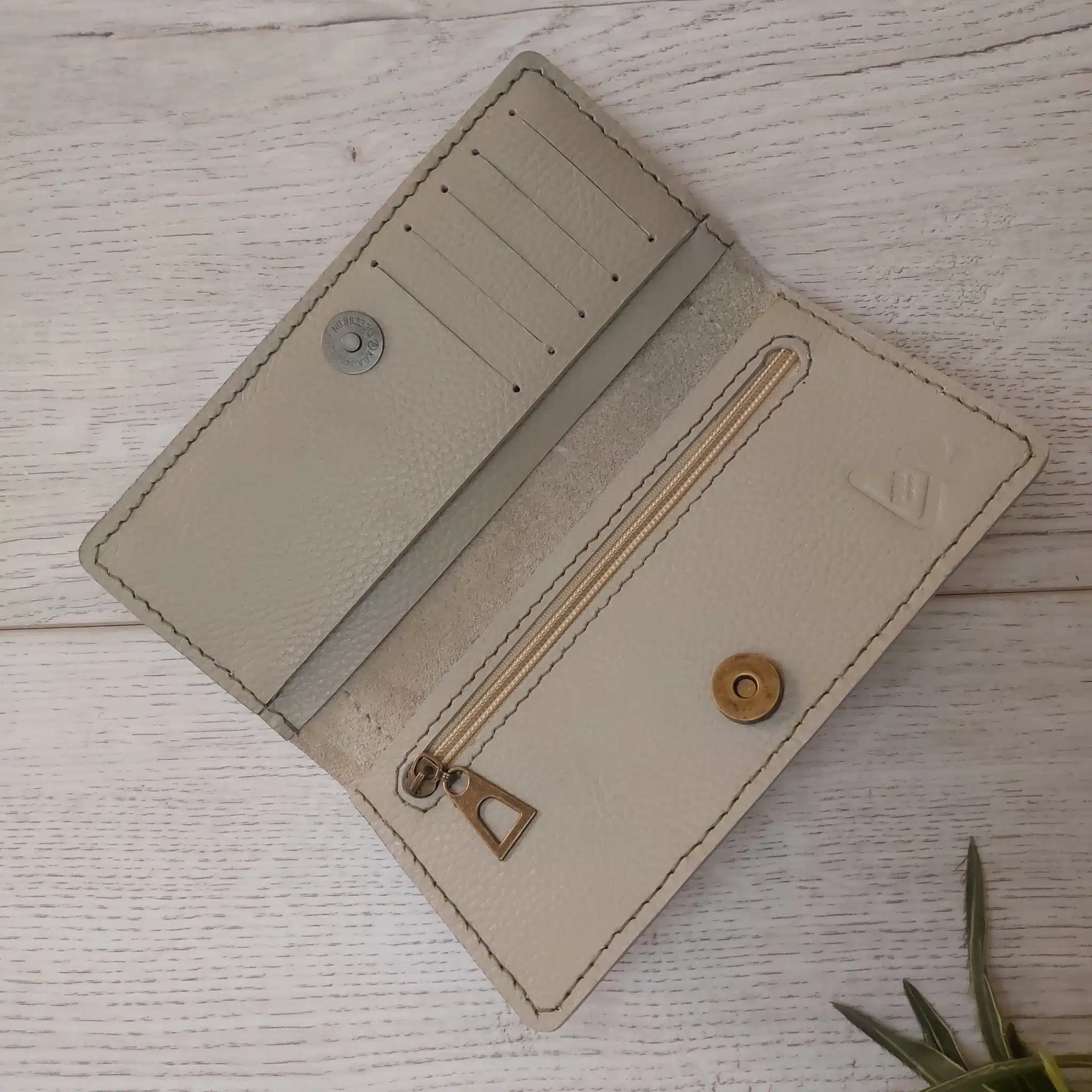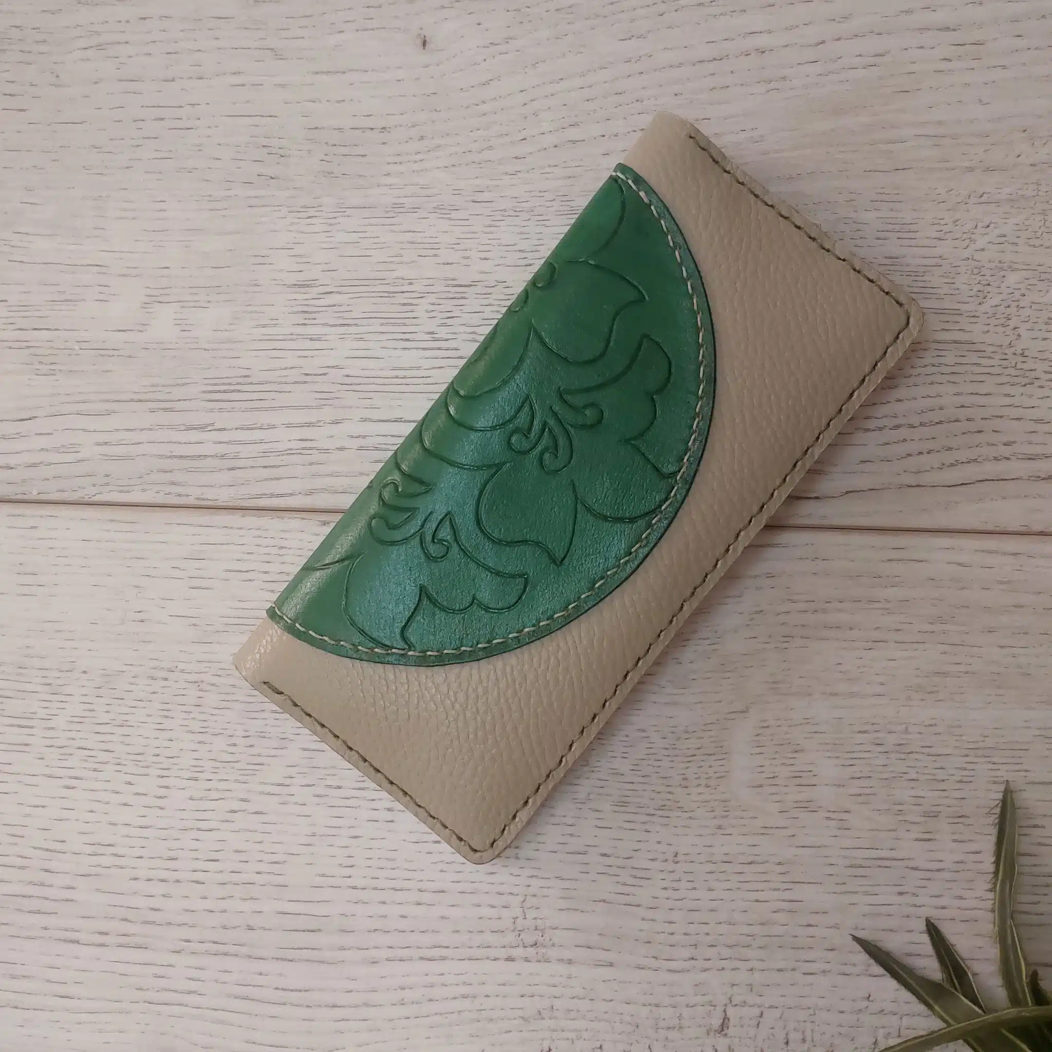 محفظة حريمى كبيرة جلد طبيعى هاند ميد لون بيج وعليها رسمة بحفر على الجلد بالون الأخضر مقاس ١٠سم ×٢٠سم