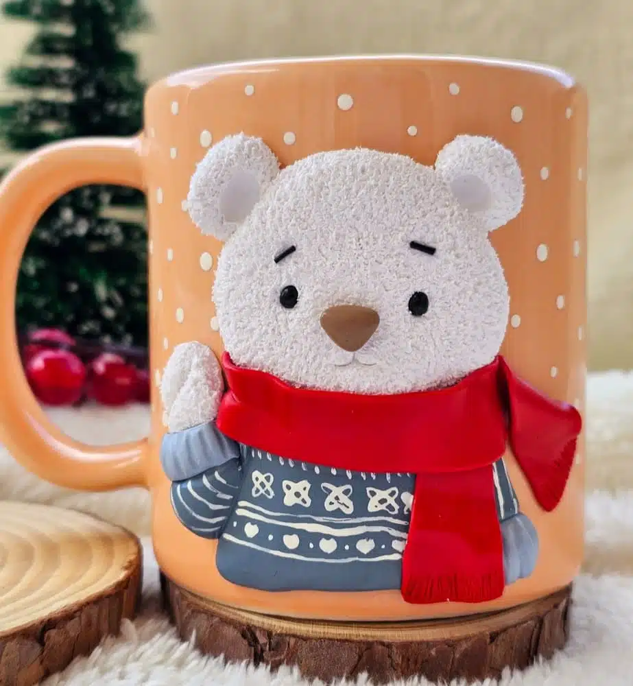 Porcelain mug with a design made of polymerclay of a teddy bear with a cute hand painted texture