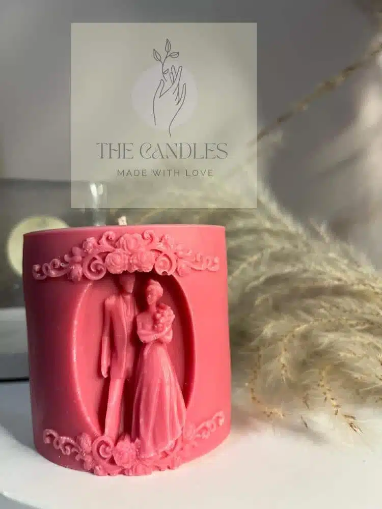 This candles is considered two candles in one shape the face is the shape of groom and bride and the background is Mrs&Miss