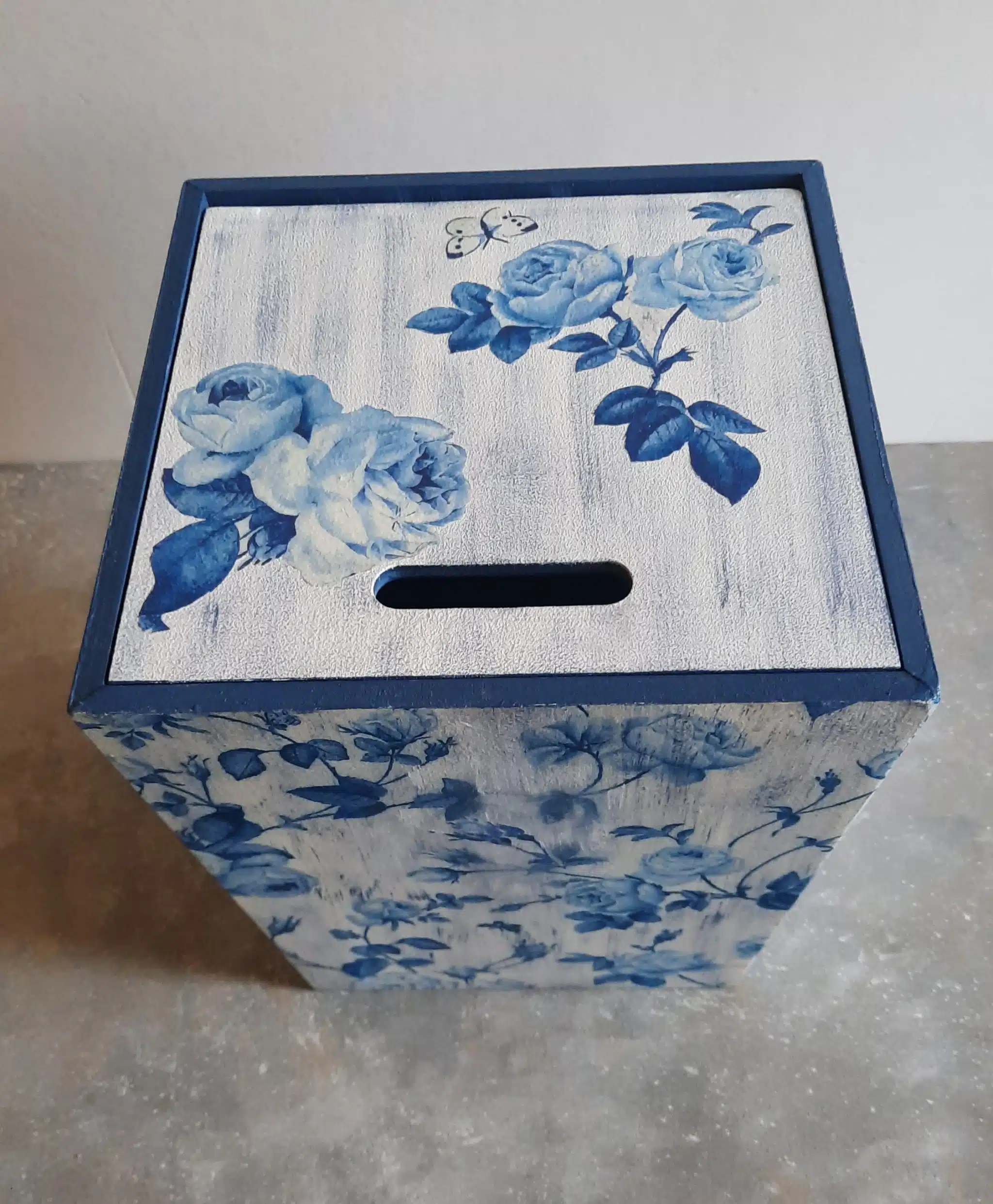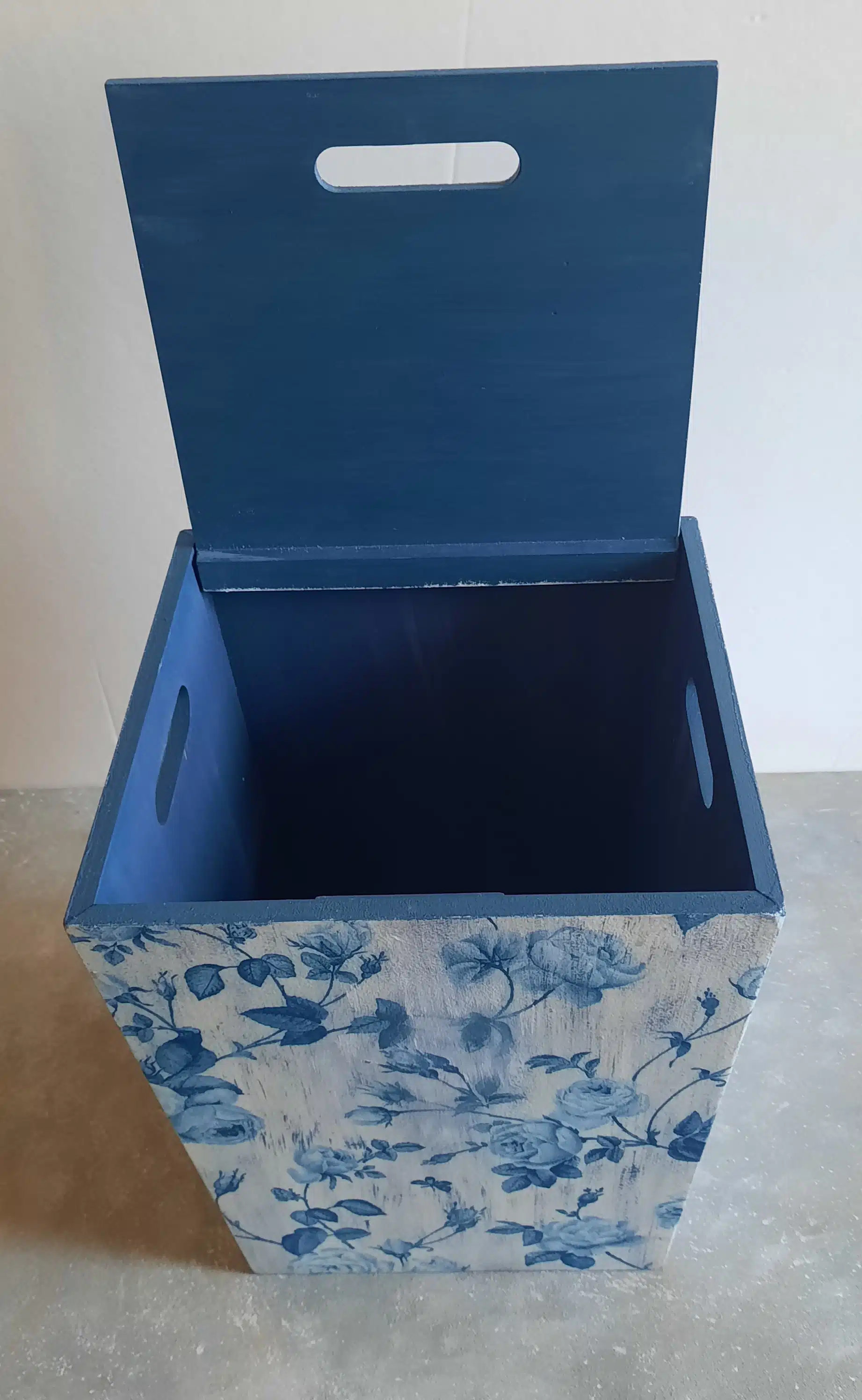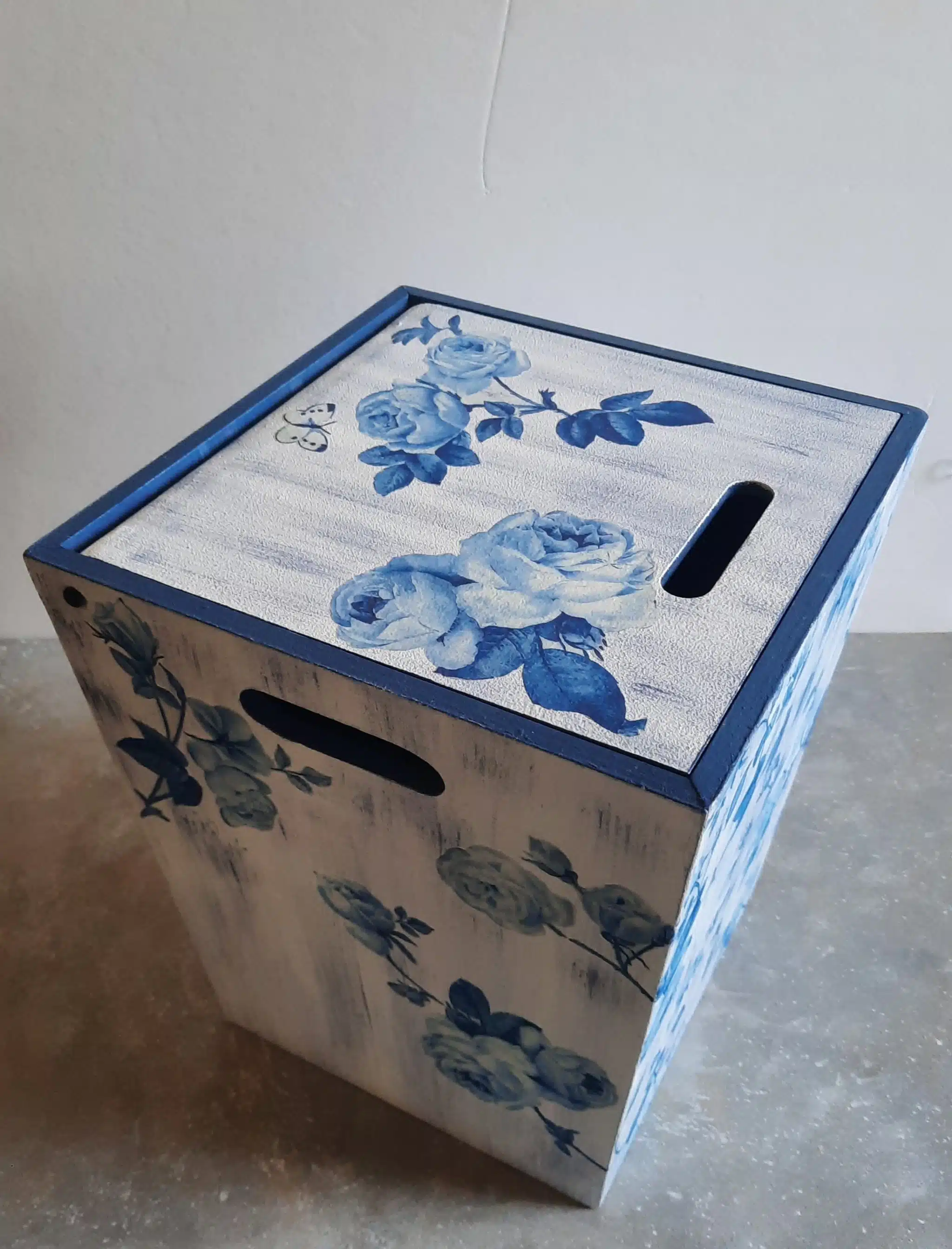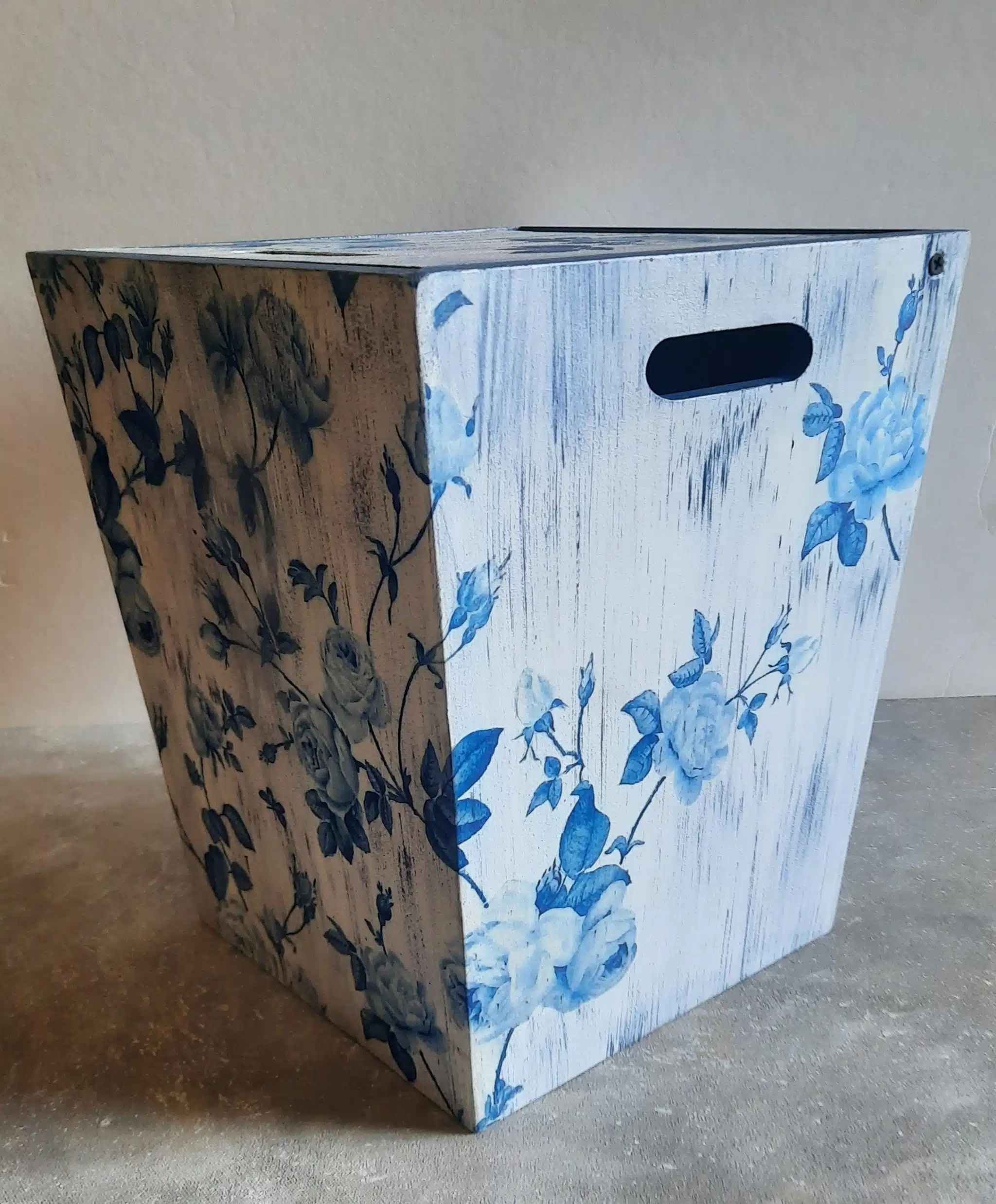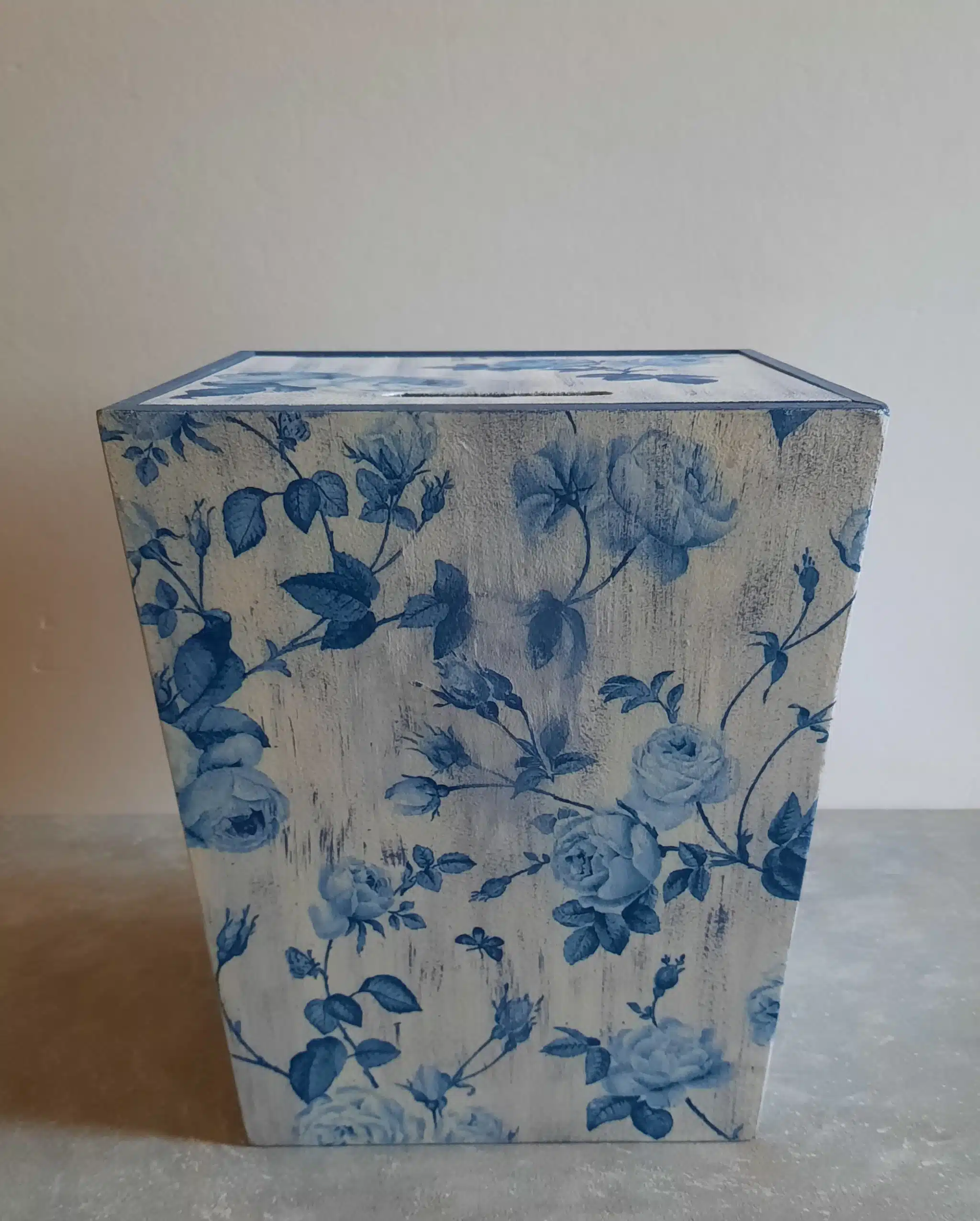 Wooden trashbin 20×30 cm decoupaged with a floral white and blue pattern to add a cozy atmosphere to your living area can match it with the floral lamp