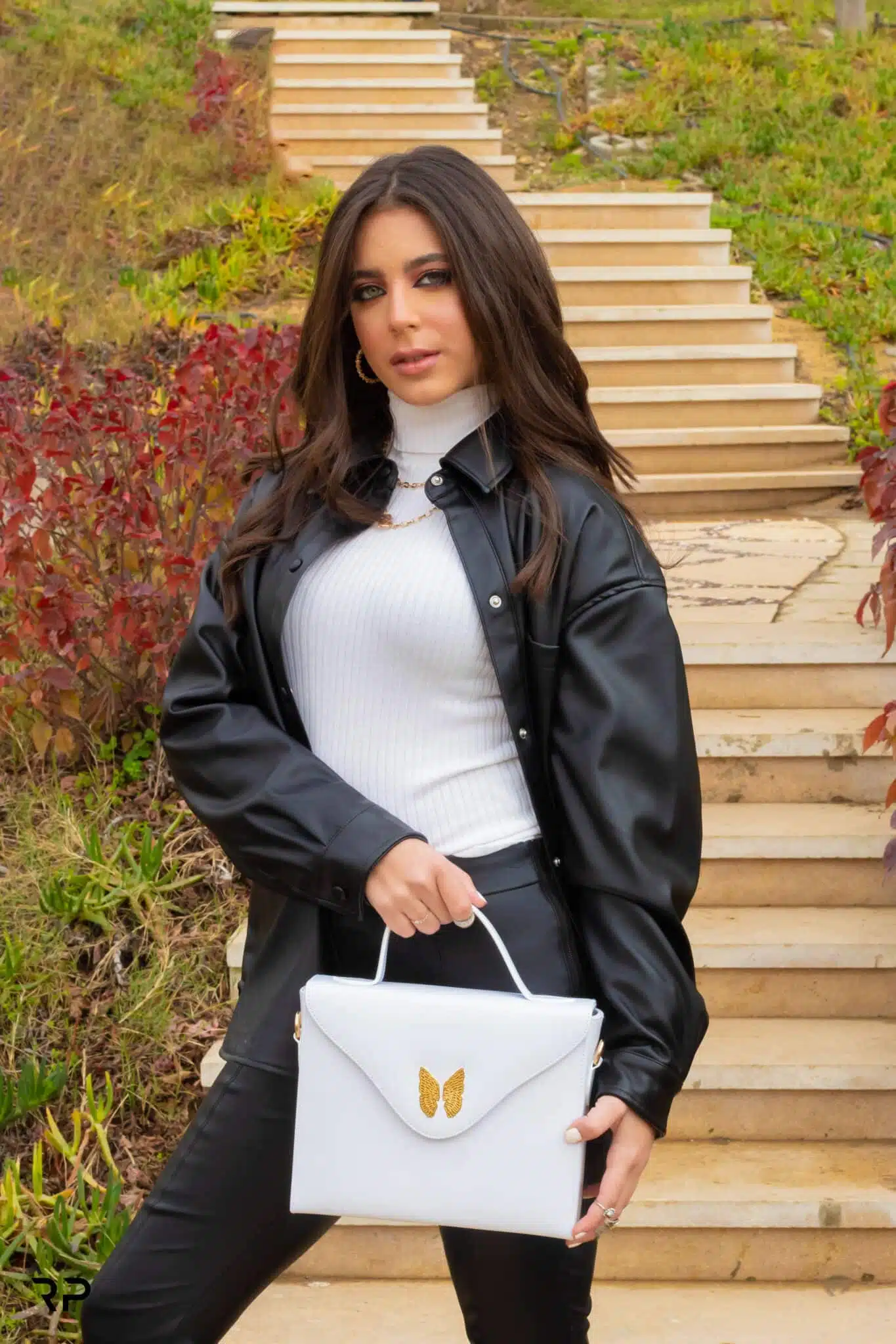 White leather bag with gold plated logo