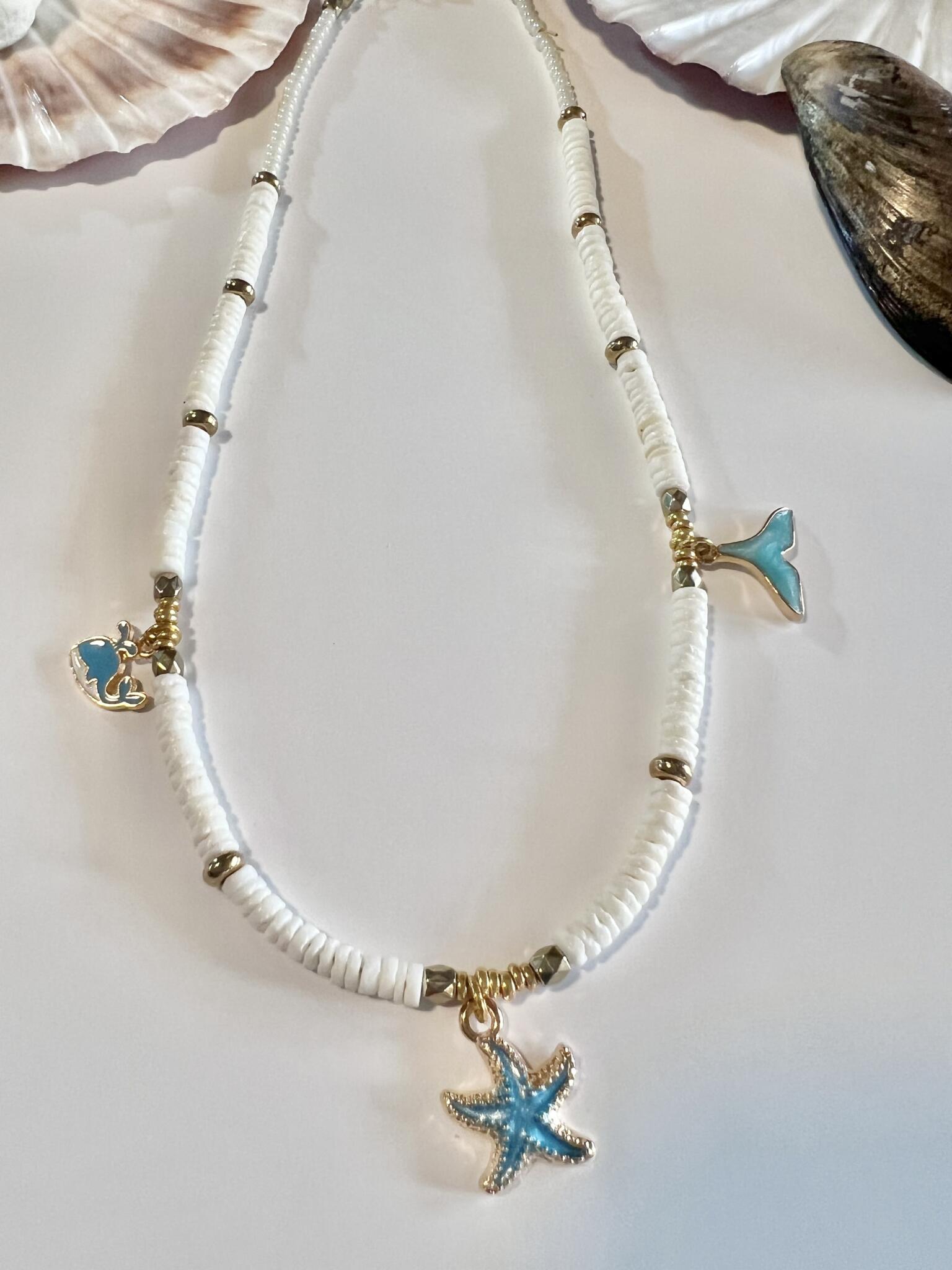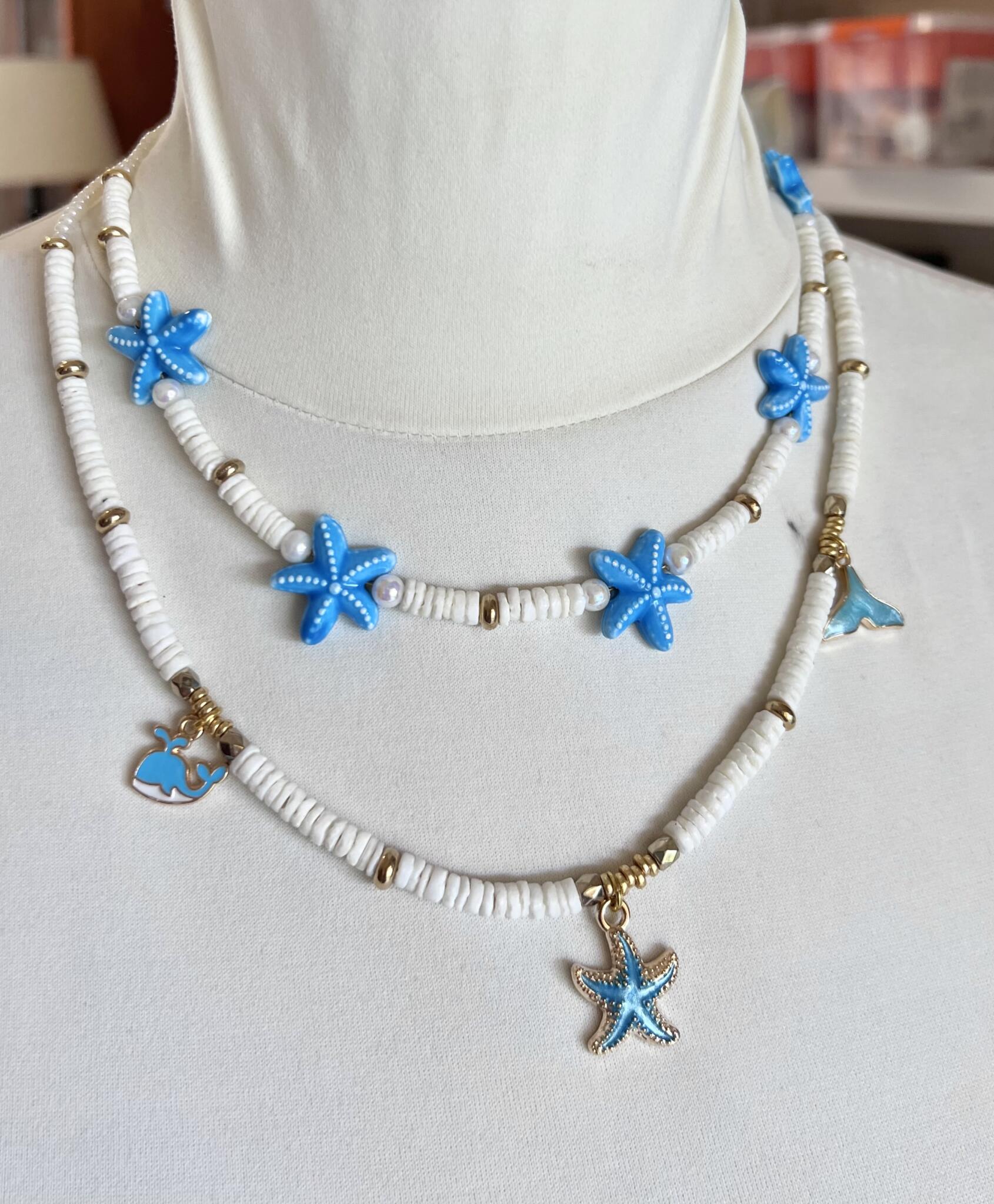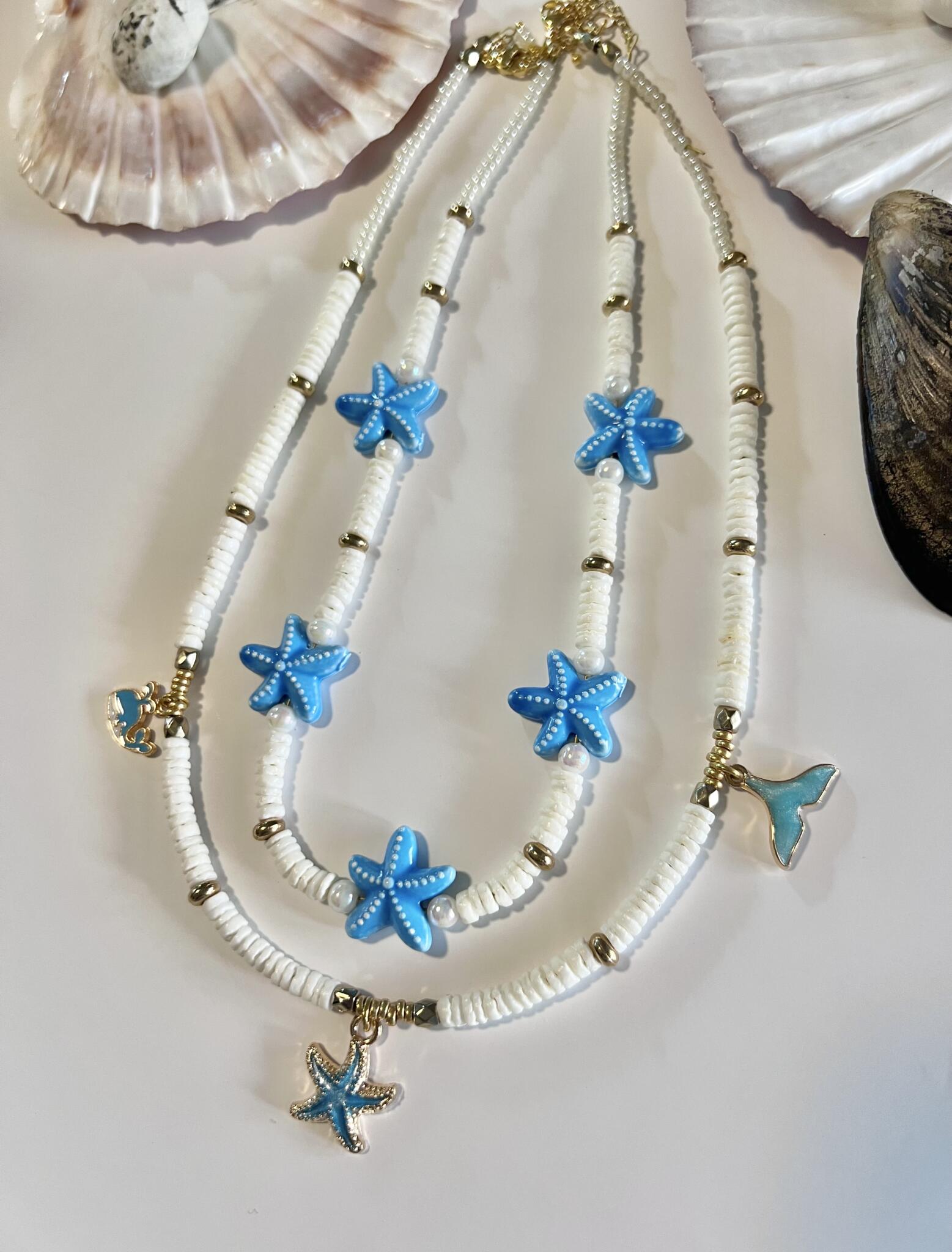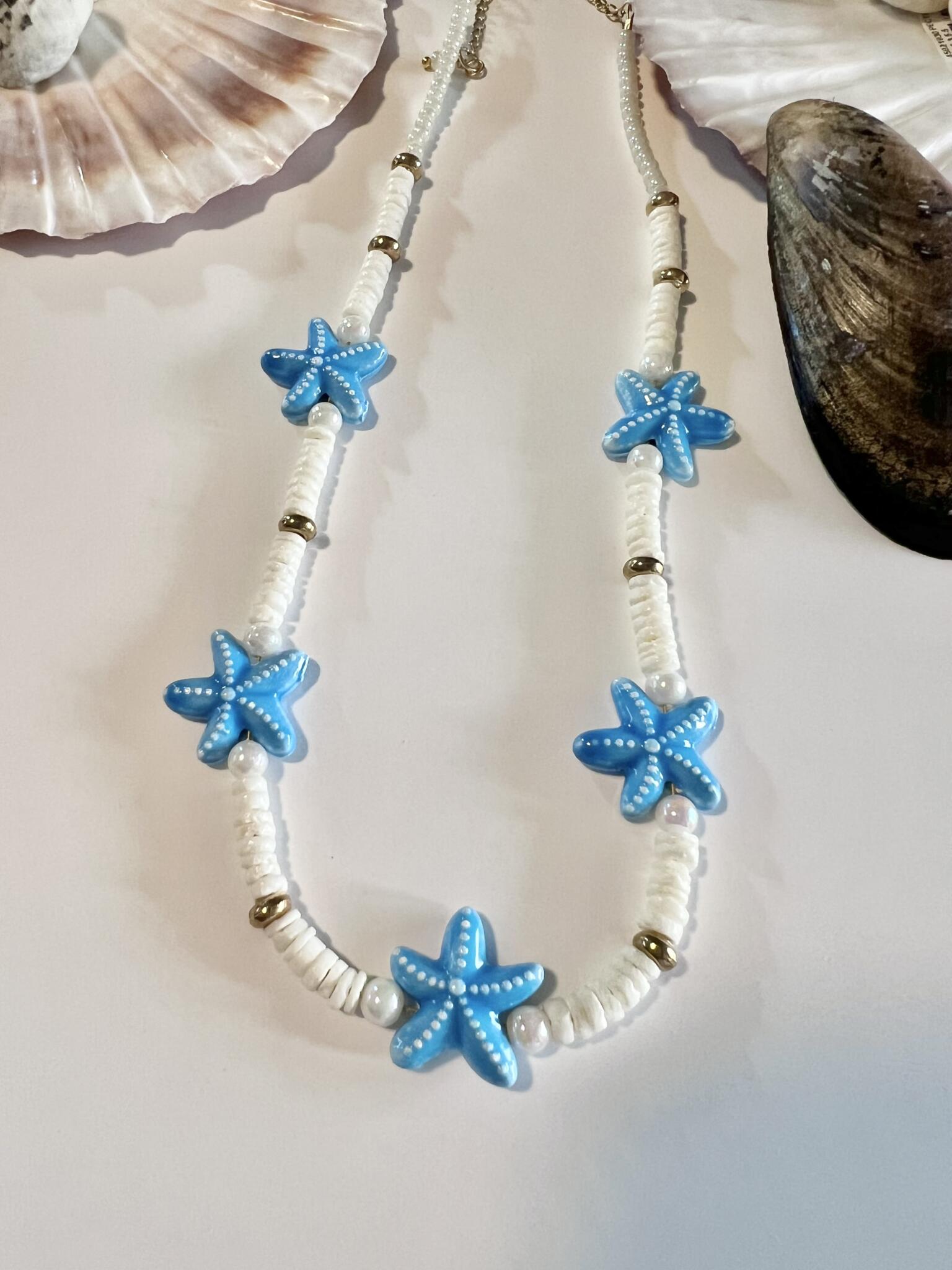 first one, white shell heishi beads, glass beads, with ceramic blue starfish beads,gold filled chain & clasp.