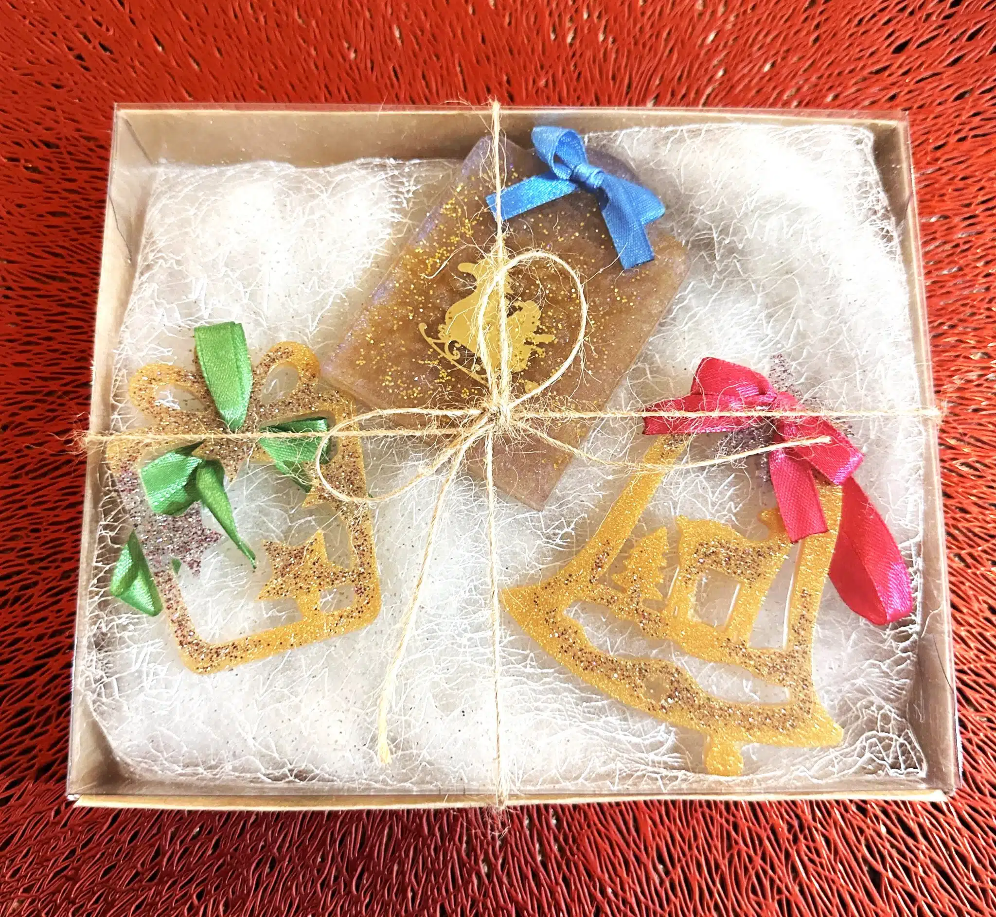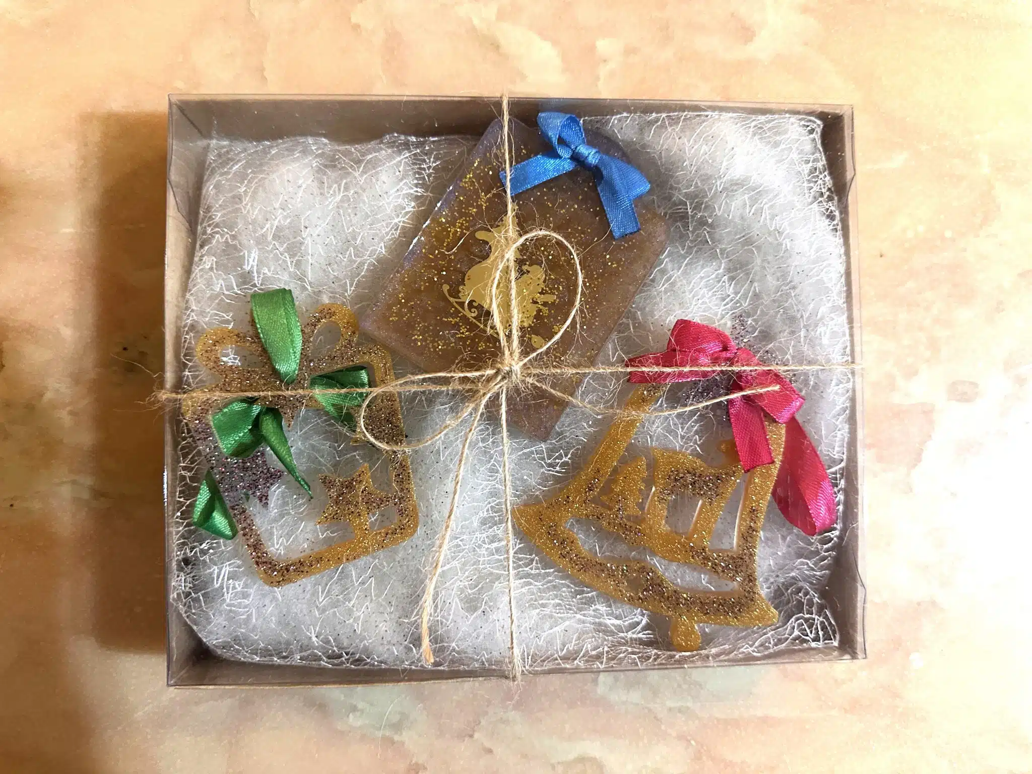 This is a set of 3 different Christmas tree ornaments. One bell shape, one gift shape and another rectengular shape with a Santa Claus sticker. Their color is a mixture of gole and beige-grey with glitter and colored ribbons.