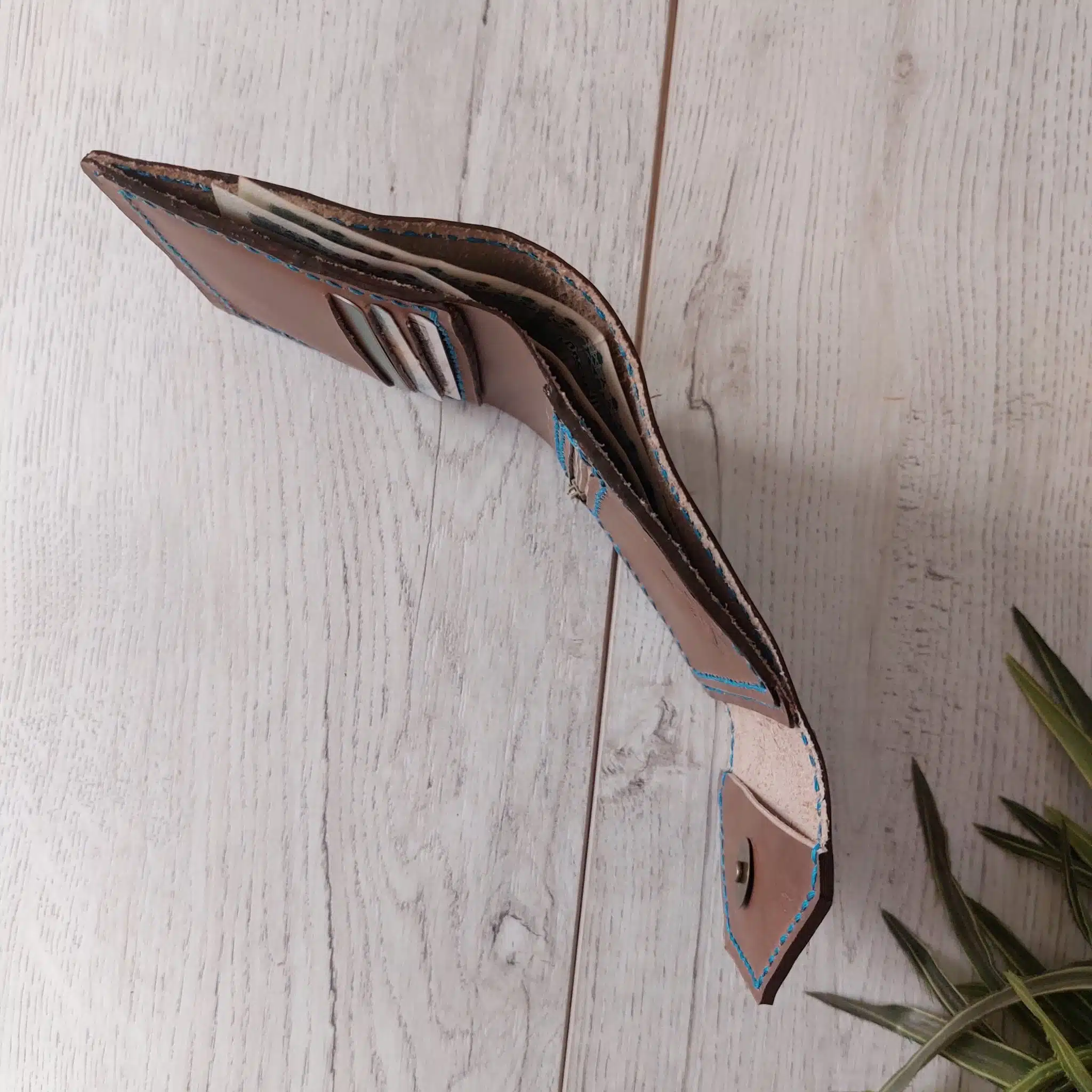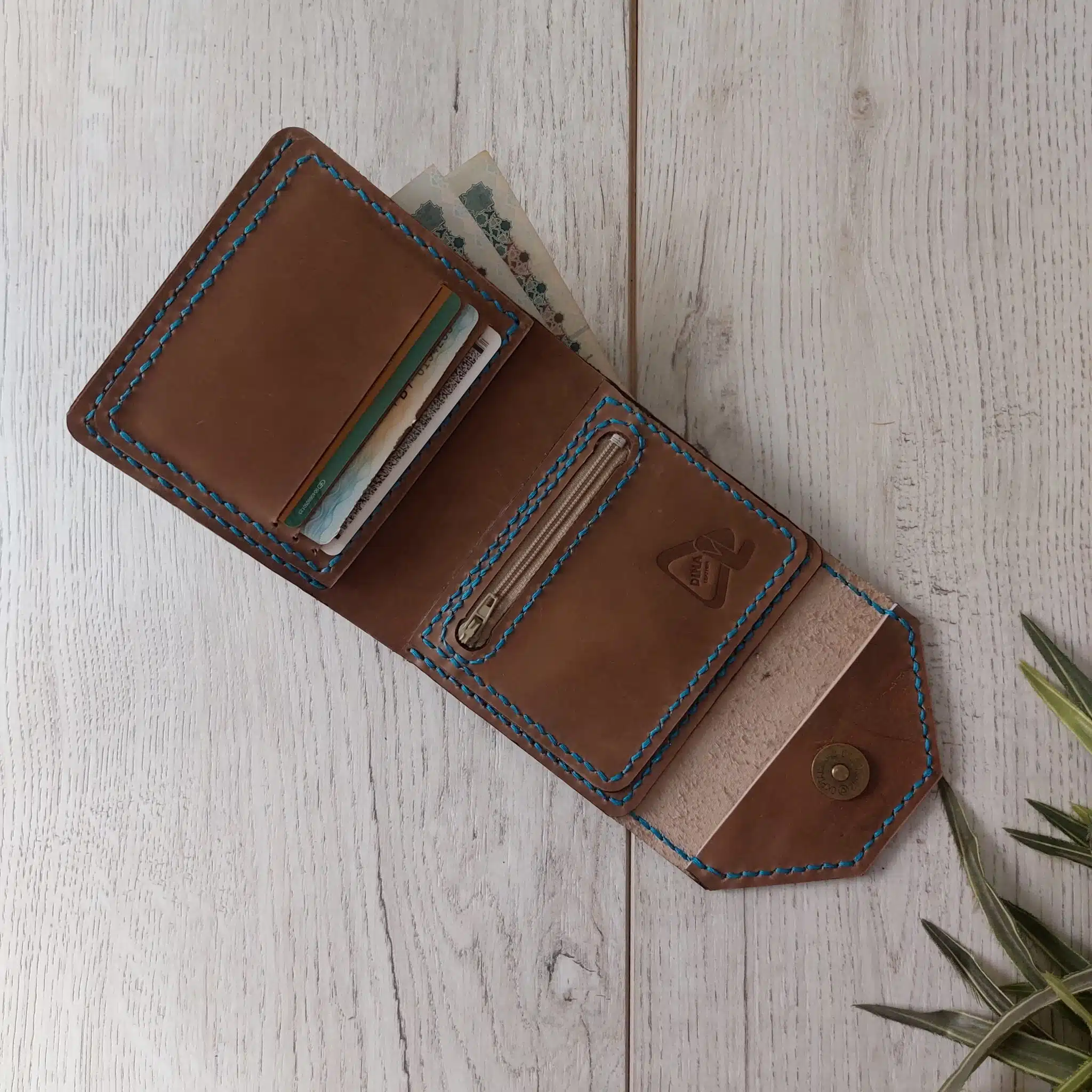 محفظة حريمى صغيرة من الجلد الطبيعى هاند ميد بتصميم مميز لون كافيه والرسمة ازرق تتكون من جيب كبير للفلوس، وجيب للعملة المعدنية ، ٣ جيب للكروت