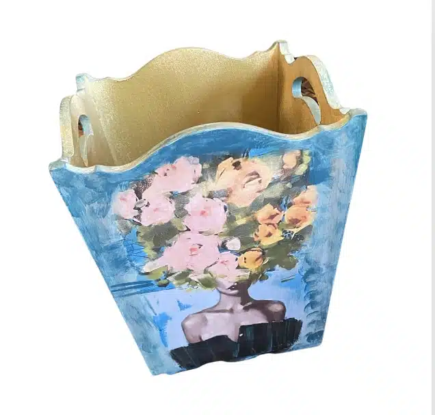 Hand painted and decoupage bin Acrylic colors with a water resistance coat