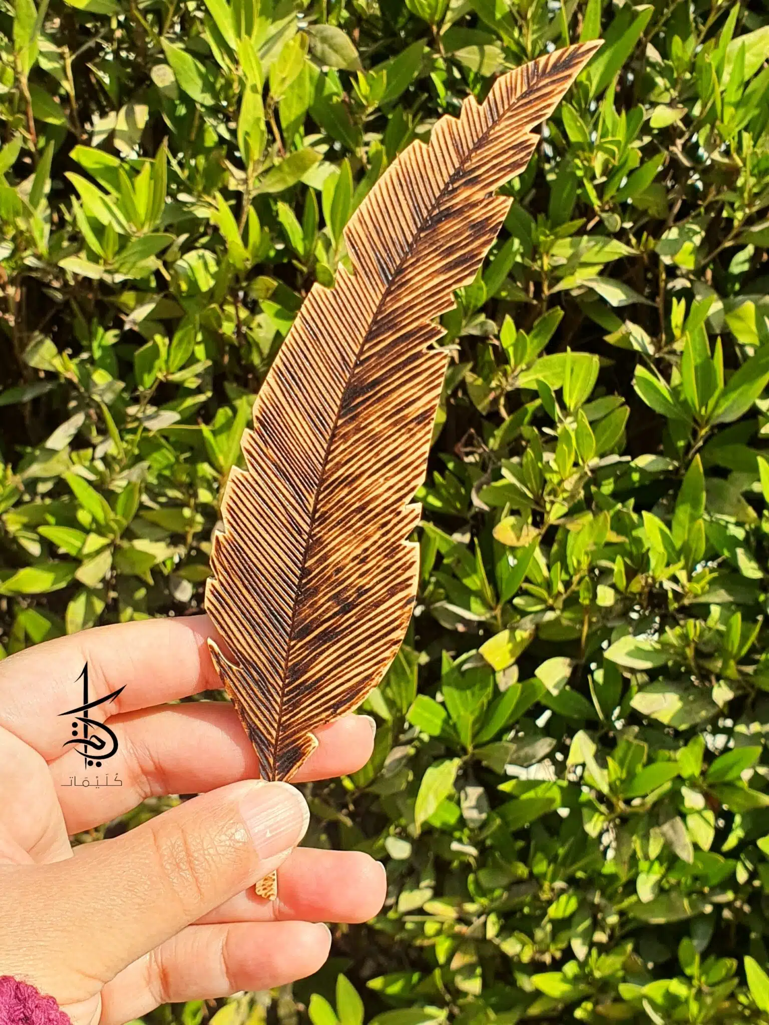 Wooden feather bookmark with a hand-burned design.
