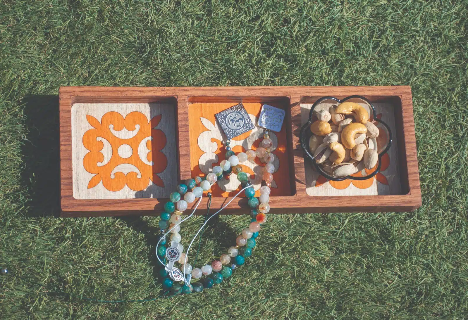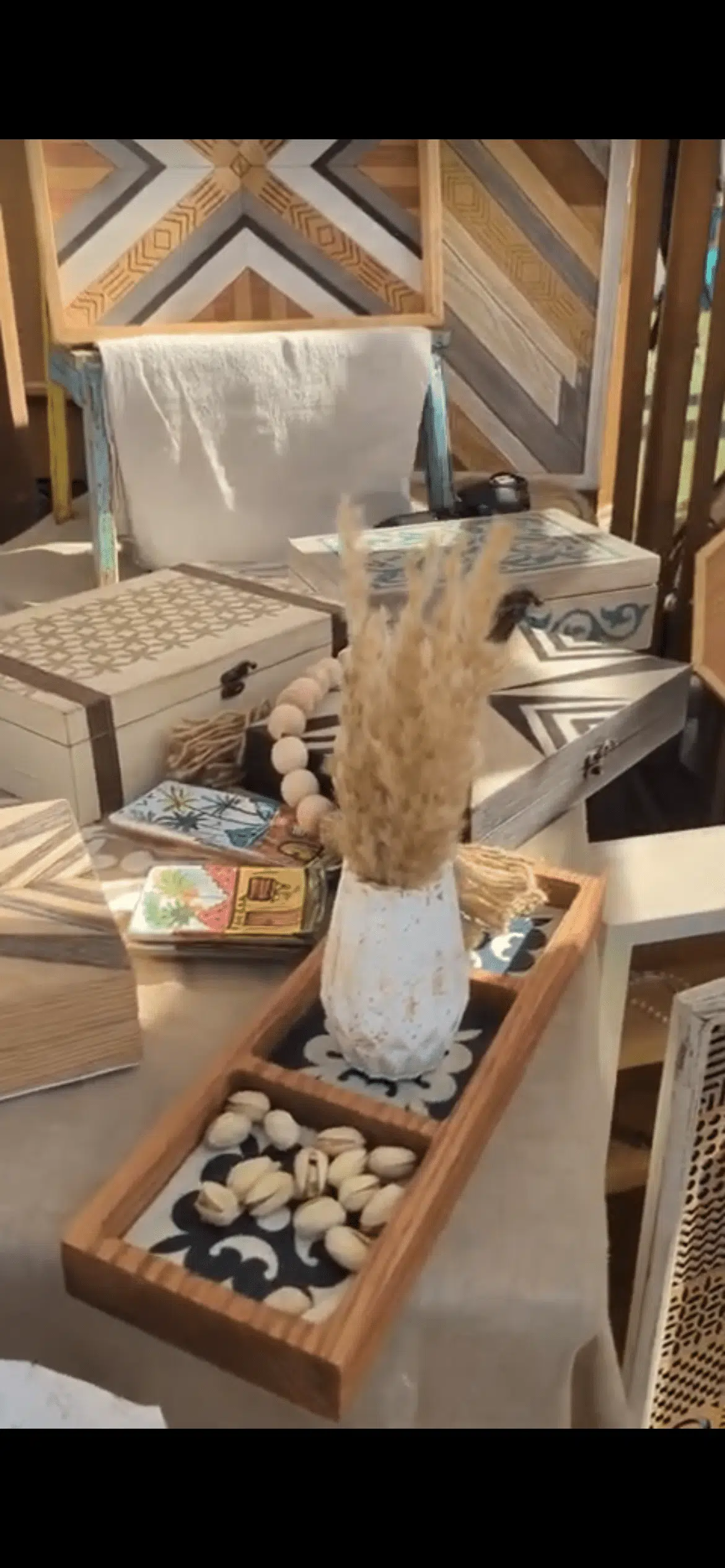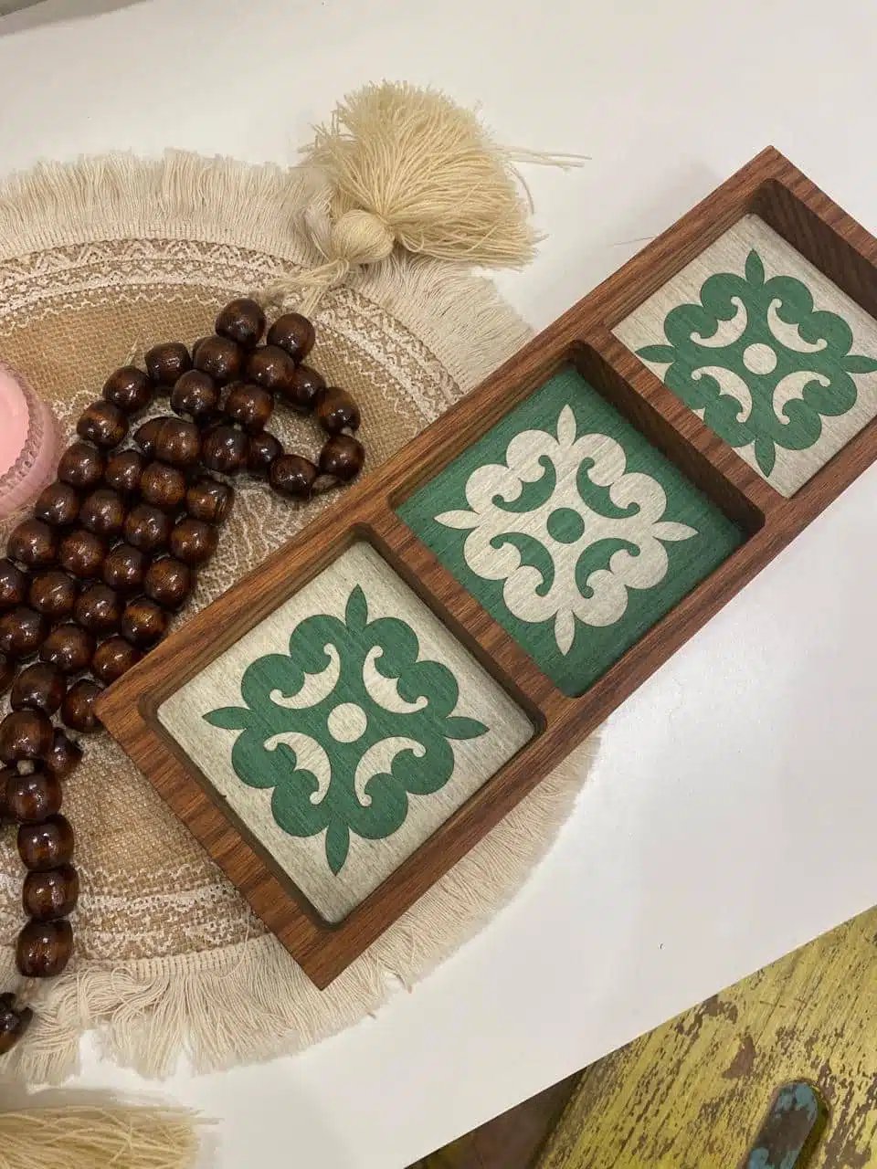Made from natural oak wood designed with colored wood veneer isolated by natural coconut oil safe for food