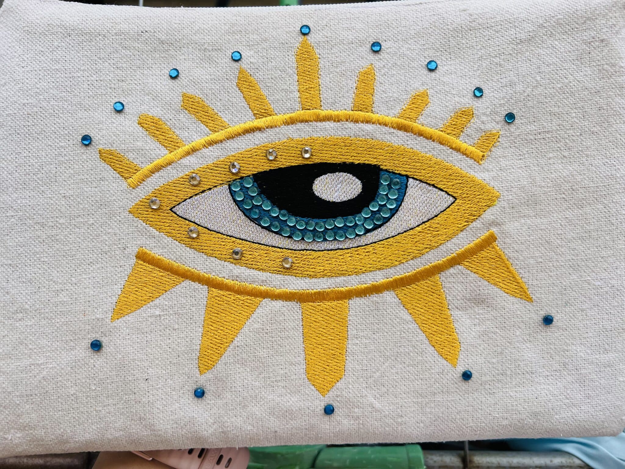 Vibrant clutch with embroidered yellow eye and radiating sun rays. Bold blue iris creates stunning contrast for a mystical statement piece.