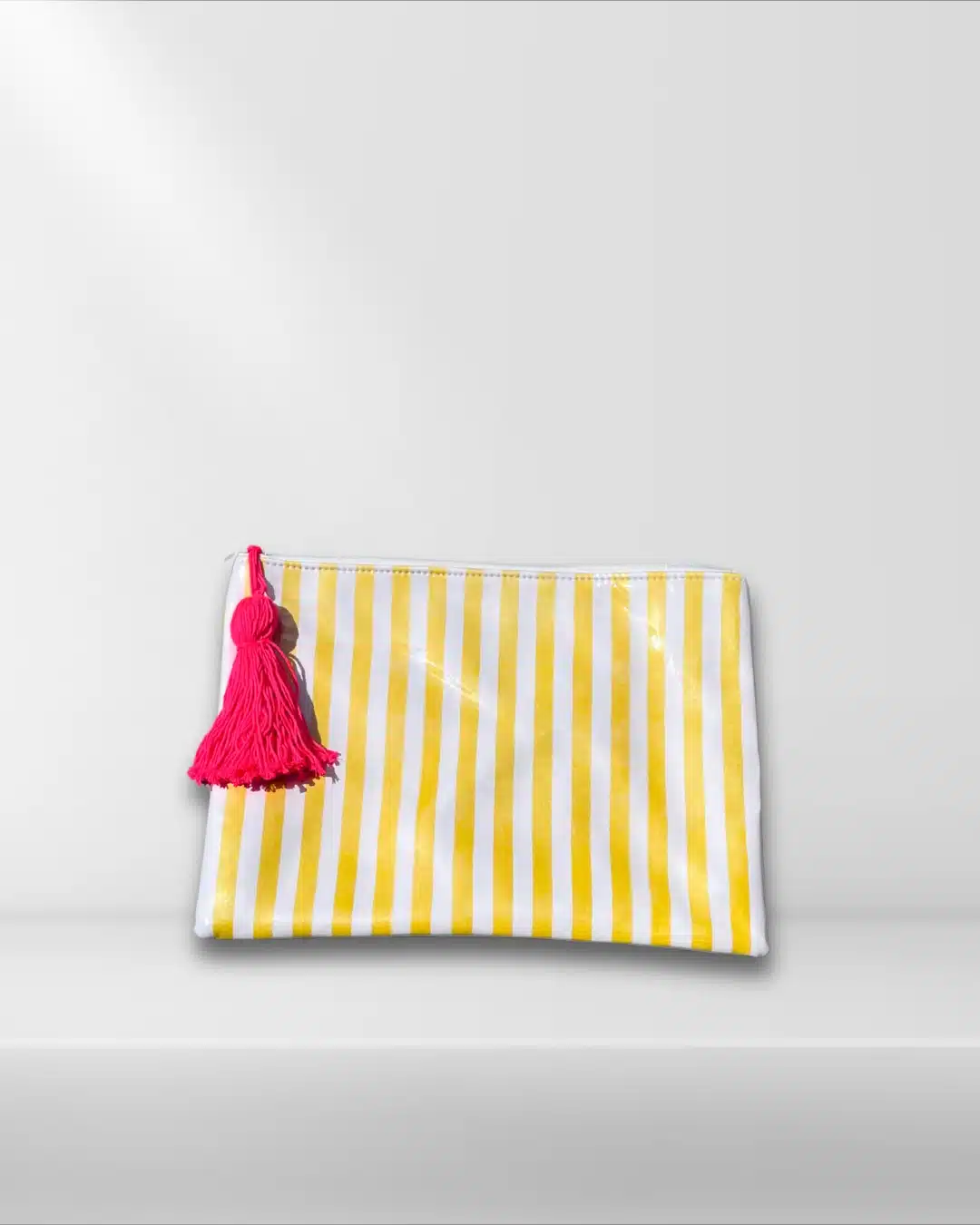 Plastic Wrapped Pouch size 25x35cm , in yellow & white striped pattern with fuschia tassel,