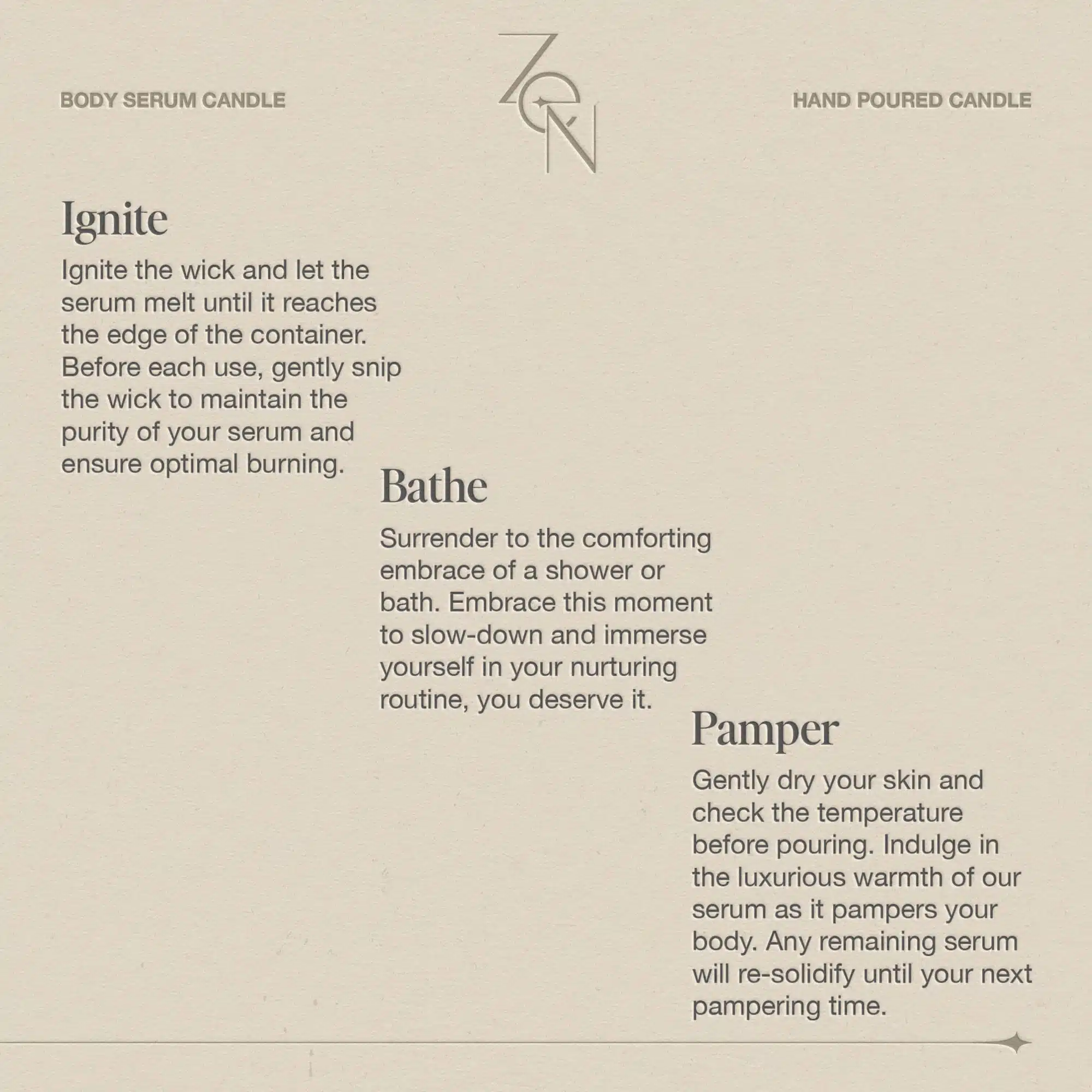 Zen Body Serum Candle is a combination of 9 face grade botanical oils, extracted naturally from plants by hand with cold press techniques, along with beeswax and shea butter.